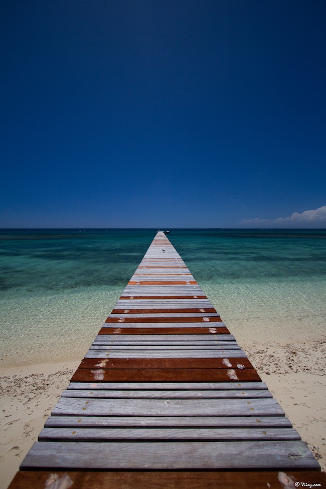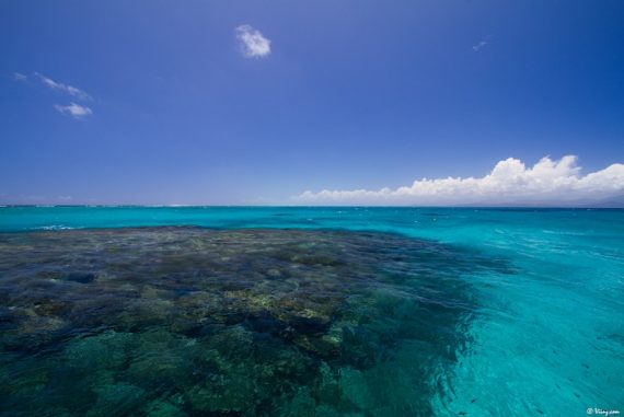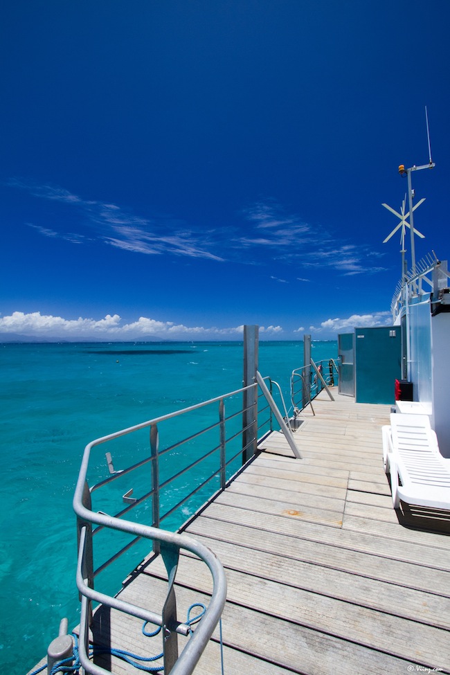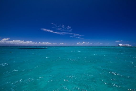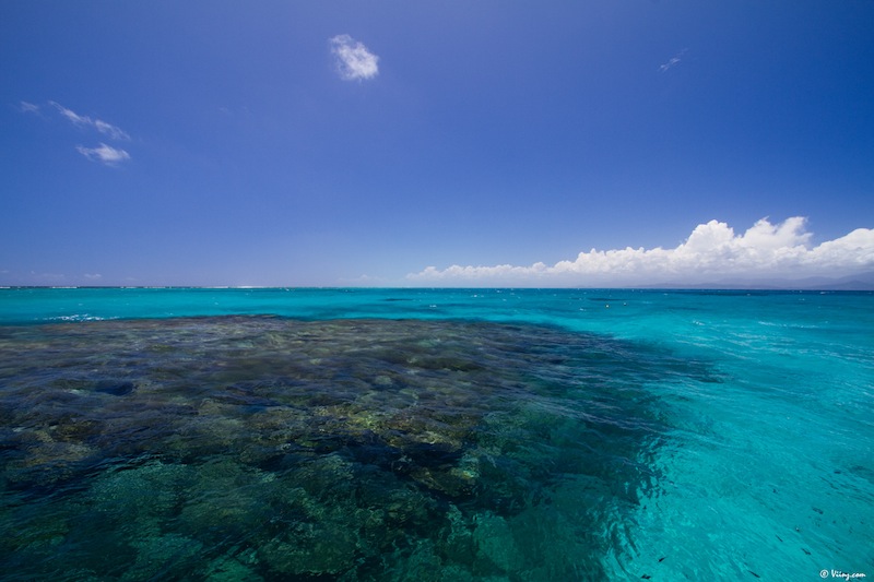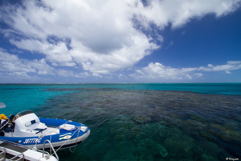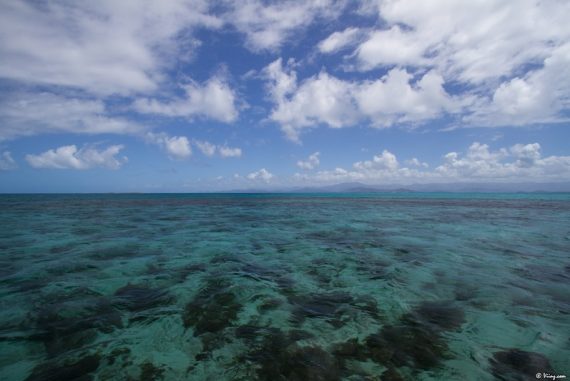 Les courants sont forts au niveau des passes qui, selon la légende, abritent chacune un couple de requins tigres. On se fatigue finalement assez vite avec des petites palmes, les grandes palmes sont absolument nécessaires si l’on veut s’éloigner. D’ailleurs je commence à partir vers la patate suivante accompagné de mes acolytes. Soudain, sensation de solitude. Je me retourne, ils sont 50 mètres derrière, me disant de revenir… Rah, les dégonflés ! Car ouais, je ne suis pas non plus téméraire au point de traverser quelques centaines de mètres tout seul dans des eaux inconnues, aussi limpides soient-elles. Tant pis pour le requin léopard qui se vit sur la patate suivante. Je reviendrai. Un ferry traverse la passe sous nos yeux ébahis, on a la sensation qu’il va venir s’écraser sur la barrière. Course poursuite avec lui pour aller pique-niquer sur l’îlot Signal… perdue d’avance !