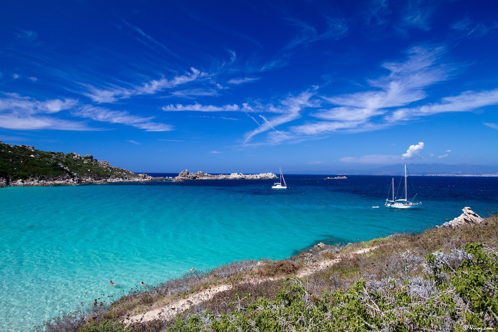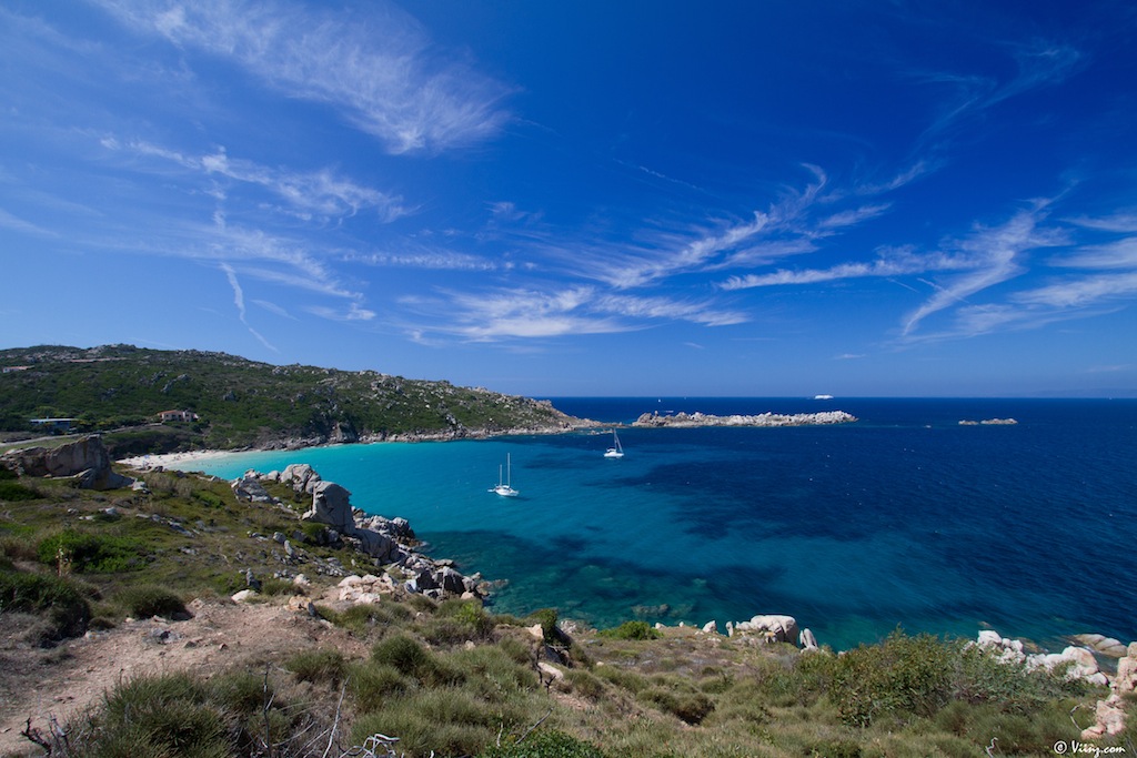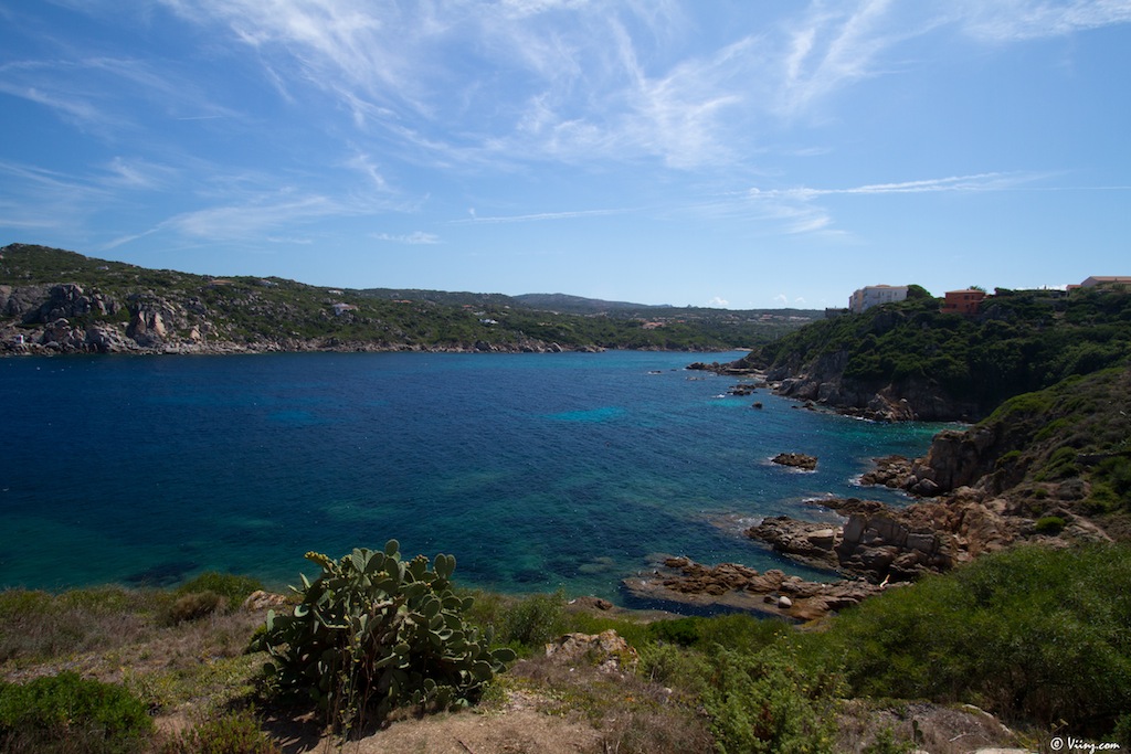 Il faut dire que la Sardaigne est riche de paysages qui, même s’ils ne sont pas non plus d’une variété absolue, montrent des visages bien différents en fonction de l’endroit où l’on se trouve. Ainsi, tout au nord de l’île siège la fameuse ville de Santa Teresa di Gallura. Au loin, les falaises de Bonifacio se détachent, une crique aux falaises abruptes sert de plage à la ville perchée sur son nid d’aigle et surveillée par une antique tour génoise. Délicat paysage, je ne me lasserai jamais de ce genre de coins et l’eau était tellement bonne !