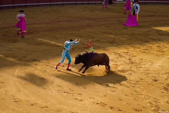 Seconde partie… les banderilles, appliquées deux par deux et à trois reprises par les peones… Le peone va seul face au taureau, l’appelle, le laisse charger et saute en esquivant tout en plantant les banderilles. Acte de bravoure là-aussi qui nécessite une certaine dose de talent ! Impressionnant… et là-aussi certains se ratent, nouveaux sifflements de la foule. Ou applaudissements… Il y a tout un code à saisir lors d’une corrida et le décryptage des réactions de la foule n’est pas toujours évident.