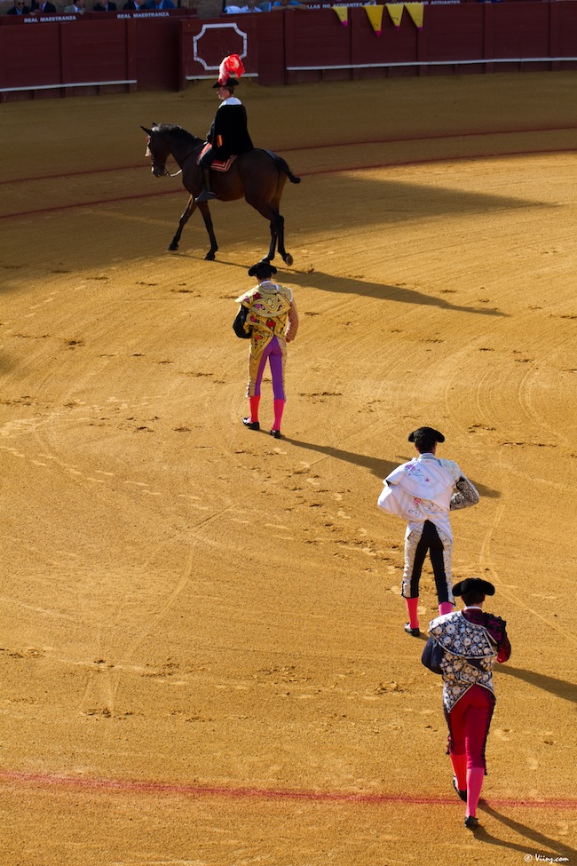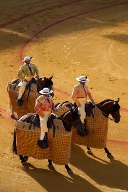 La musique retentit soudain, générant une onde de choc et de poils hérissés dans la foule… Les acteurs rentrent en scène, vêtus de leurs habits de lumière, matadors, peones et leurs capes violacées et picadors sur leurs montures solidement harnachées. La tension monte encore d’un cran en ce qui me concerne, j’ai peur de ce qui arrive.
