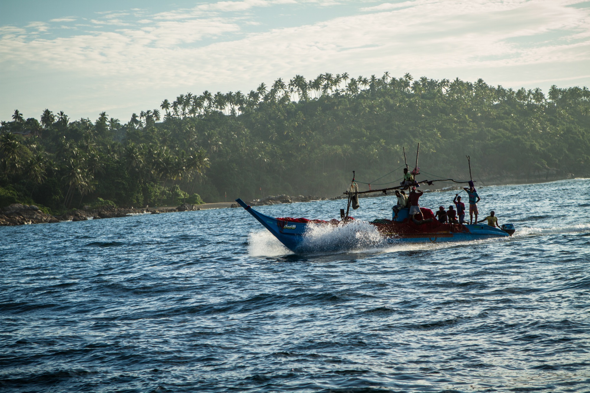 Réveil à l’aube, direction Mirissa depuis notre hôtel et embarquement immédiat pour une croisière de quelques heures, assez loin des côtes, plein sud !