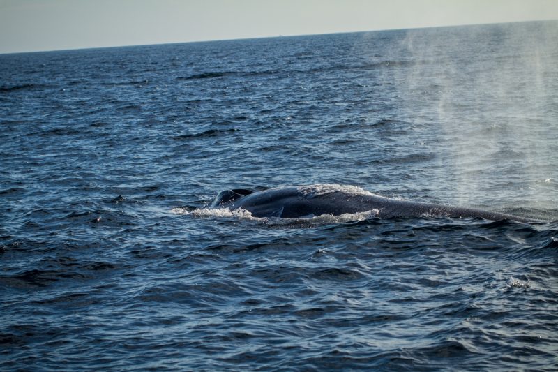 Sur la ligne d’horizon, j’aperçois soudain une belle douzaine de panaches qui se succèdent. Elles soufflent ! Le bruit n’est pas encore audible mais on se rapproche tranquillement du troupeau. Les navires ne harcèlent pas les baleines, c’est une des caractéristiques ici. L’observation est assez responsable et essaie de s’approcher sans gêner, de ne pas couper la route des baleines mais plutôt de se mettre en parallèle du mouvement, en espérant qu’en remontant de leur dernière sonde, avec les moteurs éteints et le silence à bord, elles émergent à proximité.