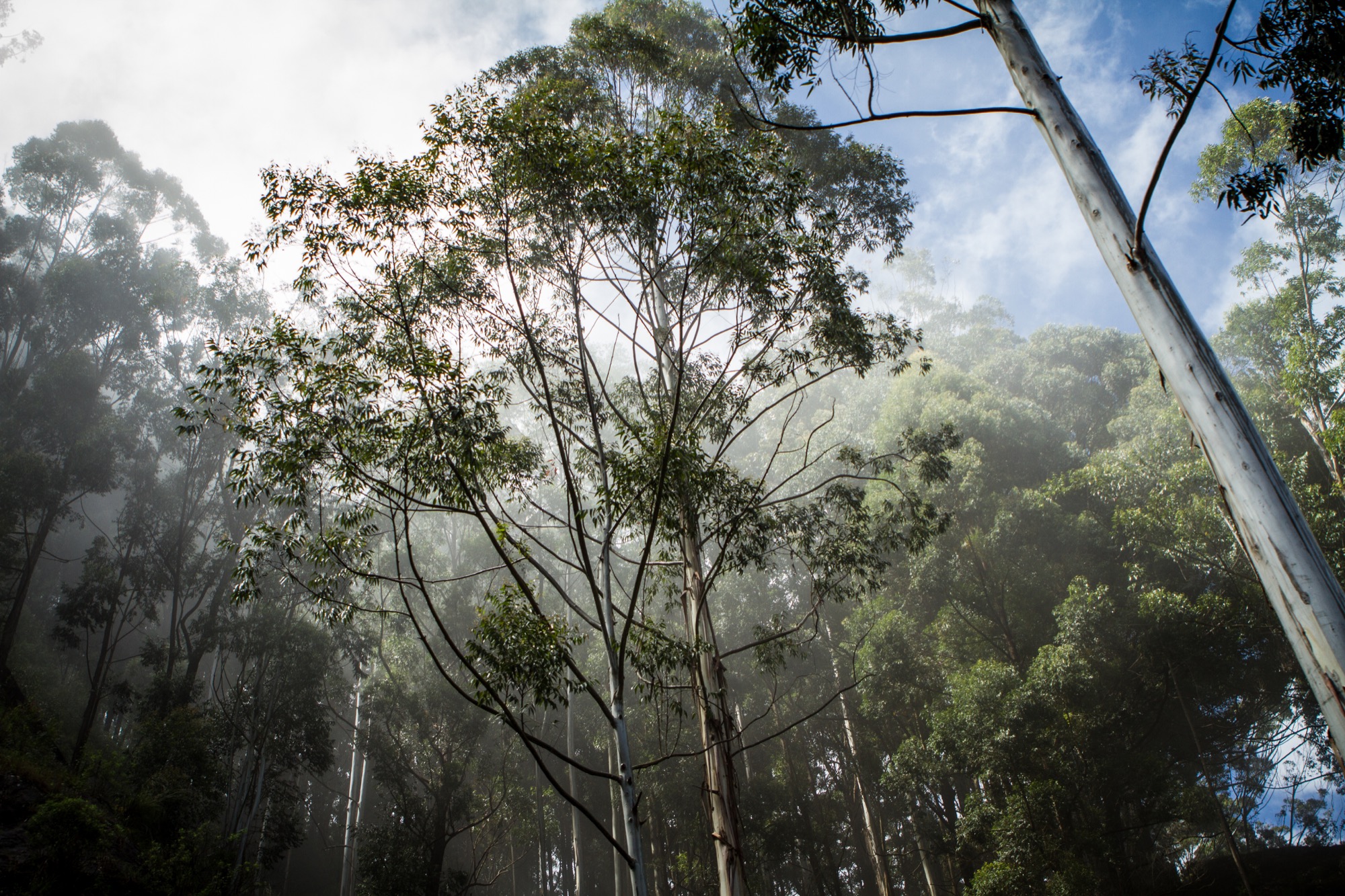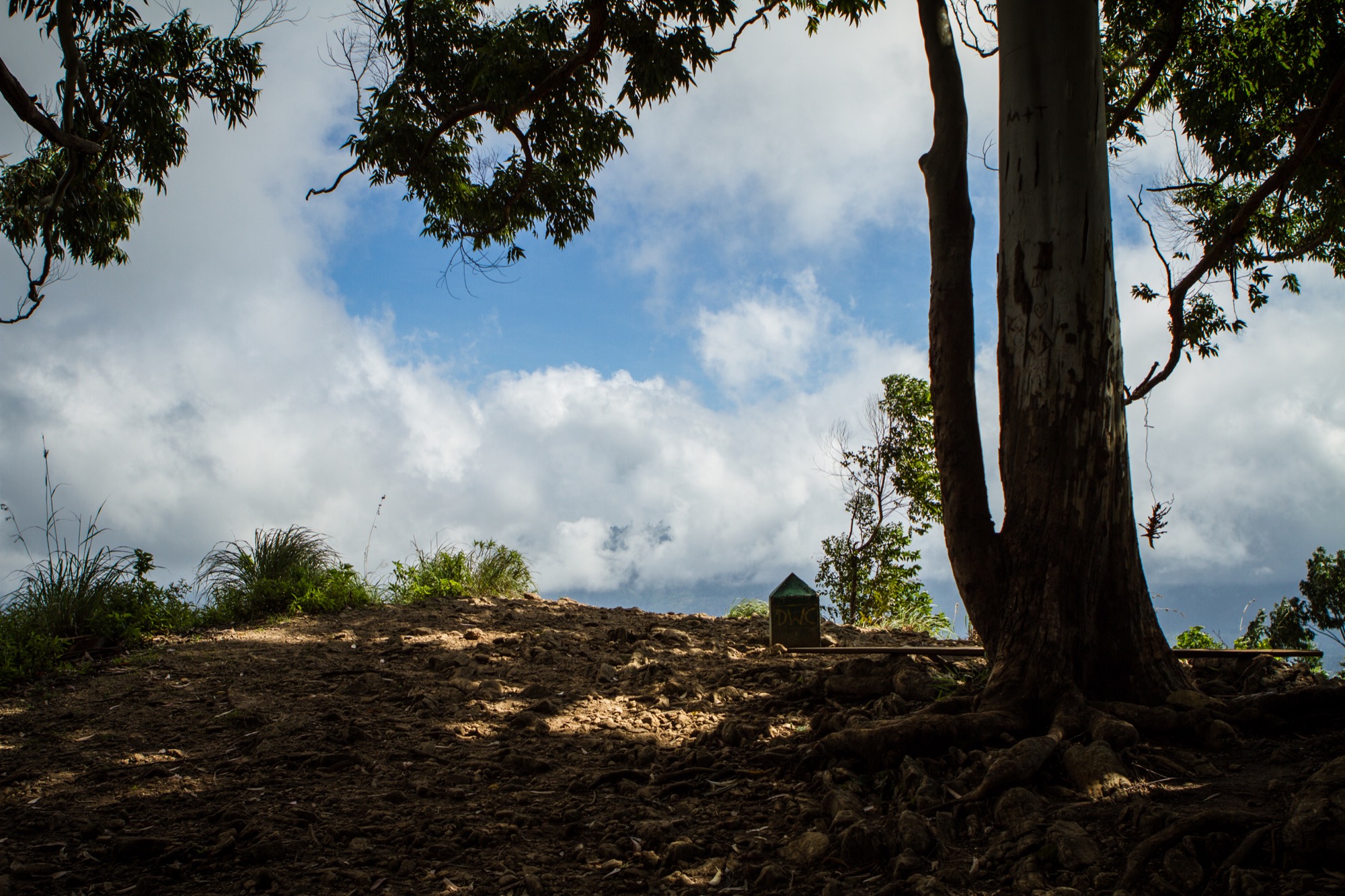 Dernière section. Raide, bien raide, au milieu des eucalyptus. Il fait relativement frais mais la température grimpe vite dans ces chemins un peu traîtres qui mènent au sommet ! Cela ne dure en tout cas pas très longtemps, avant que l’on ne sorte de la forêt d’eucalyptus, dense, apaisante. Quelle vue !