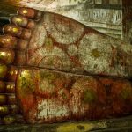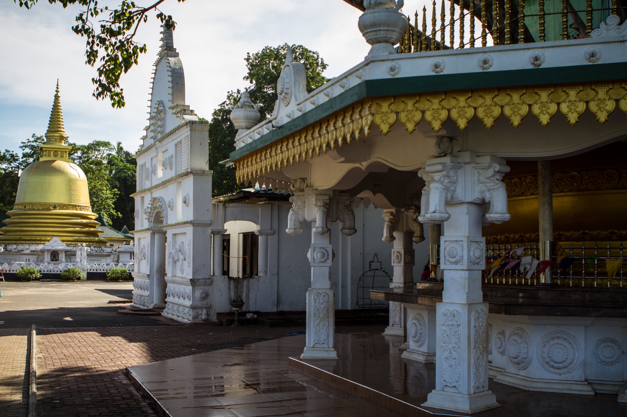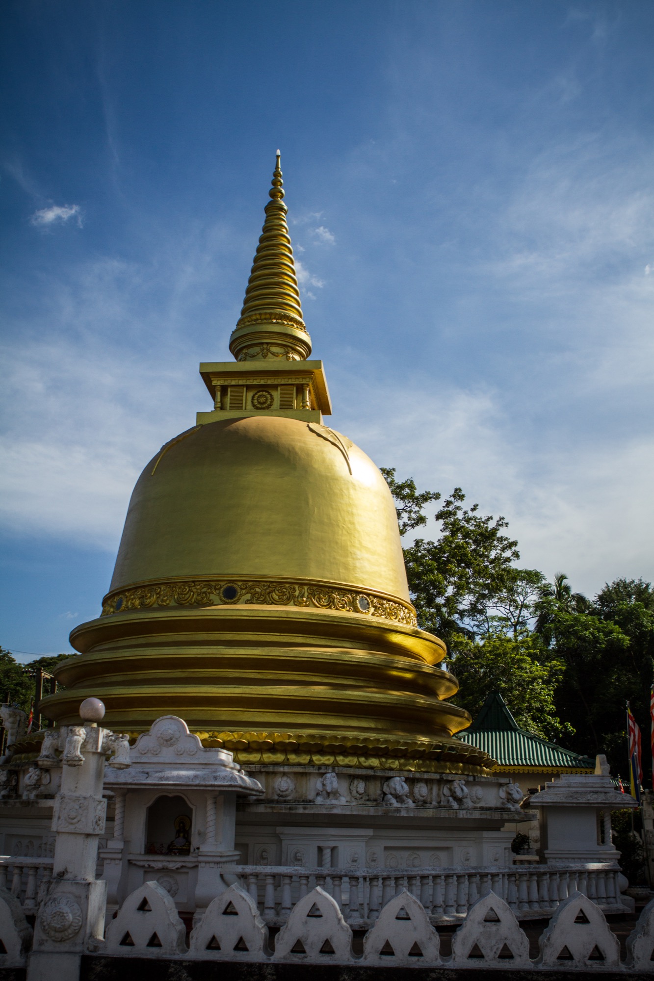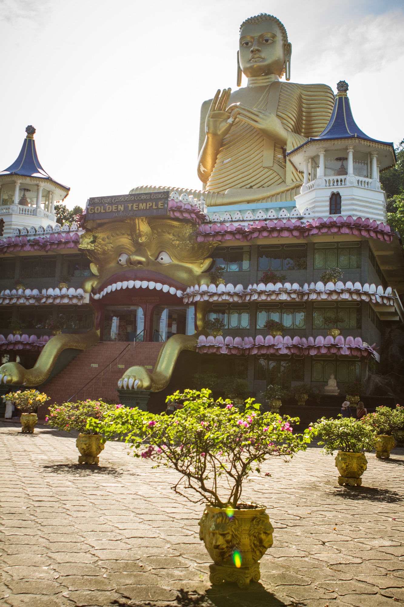 Me voici donc à Dambulla en tout début d’après-midi. Les grottes sont encore ouvertes, autant en profiter plutôt que de rester à ne rien faire dans le jardin de la guesthouse. Je ne suis pas très doué dans le domaine “rester à ne rien faire” et je ne cherche à dire vrai pas vraiment à m’améliorer. L’arrivée aux grottes est… étonnante. Des bâtiments ont poussé au pied de la montagne qui abrite les fameuses grottes sacrées. Il y a ainsi un énorme Bouddha doré, une sorte de musée kitsch au possible et quelques autres bâtisses qui donnent à l’endroit un caractère Disneyland tout à fait factice et déplacé.