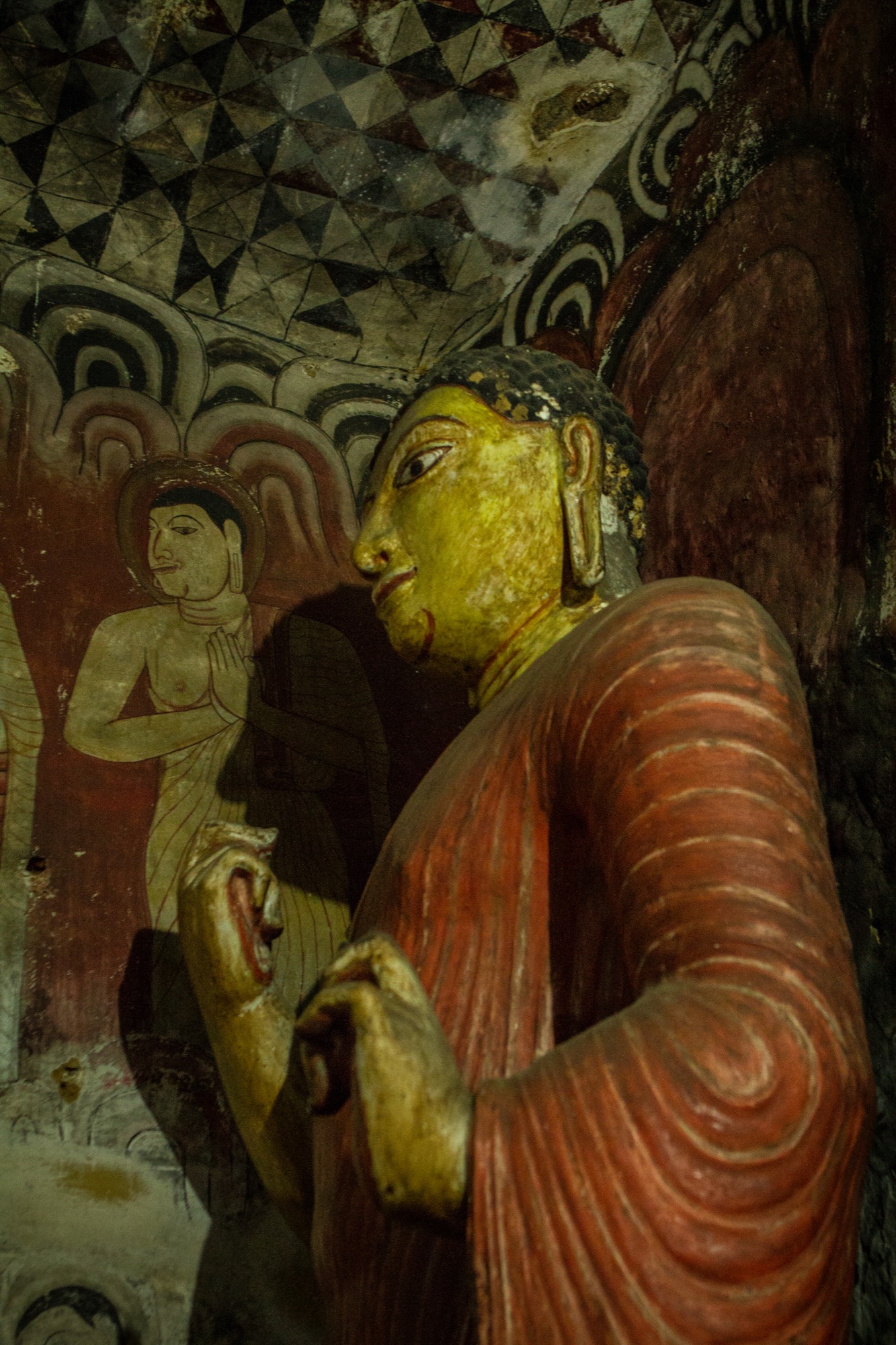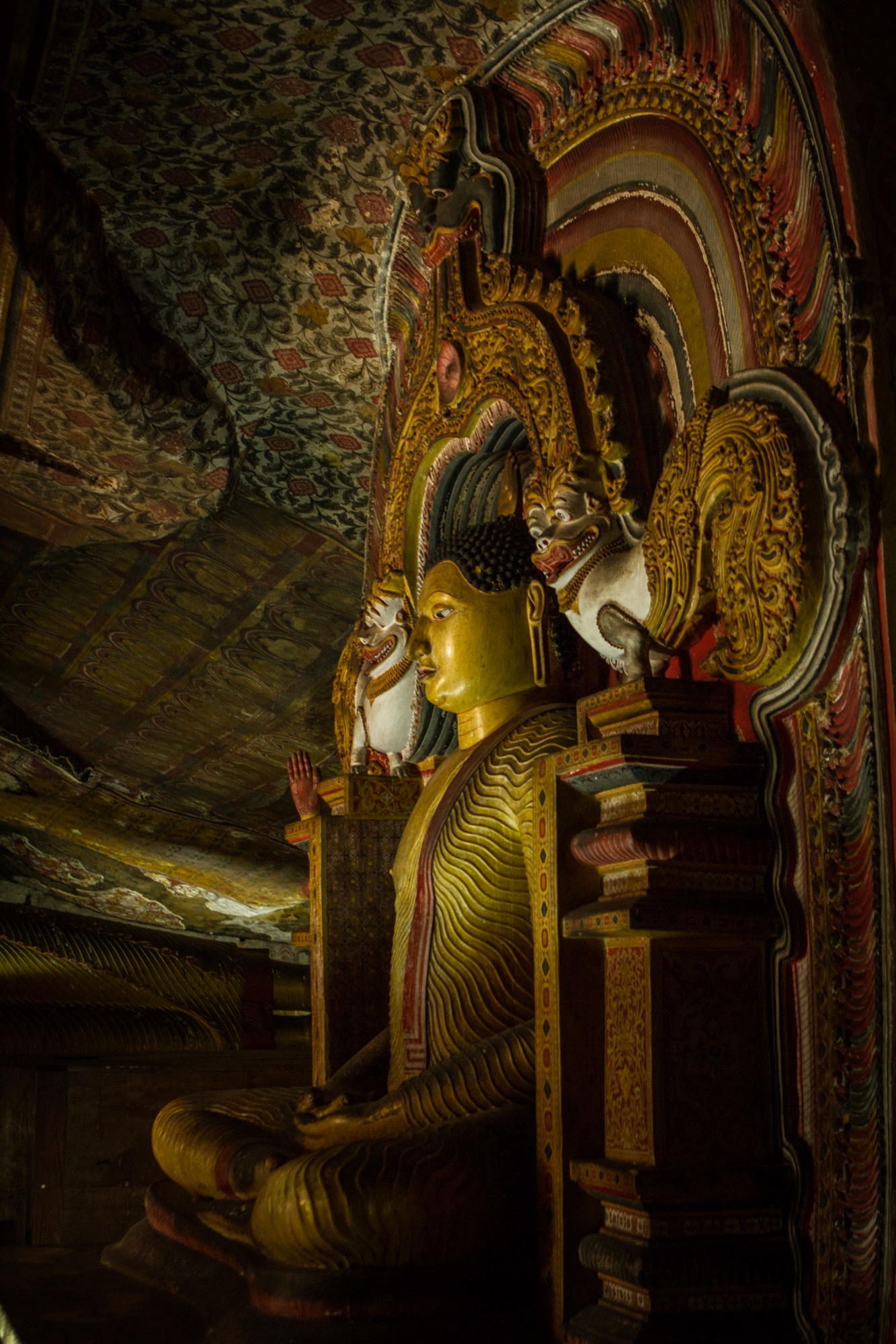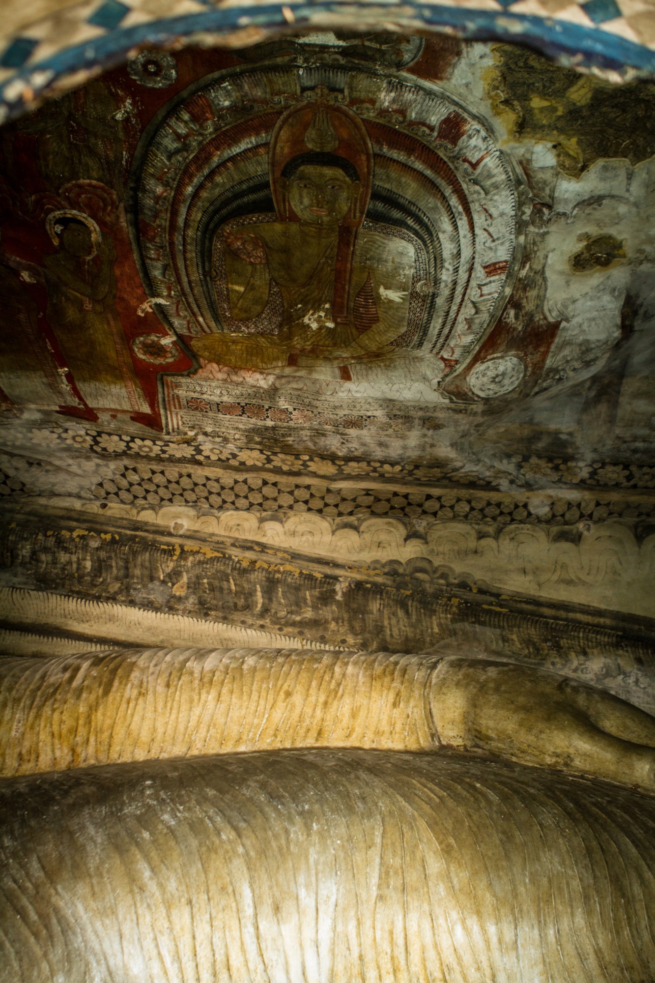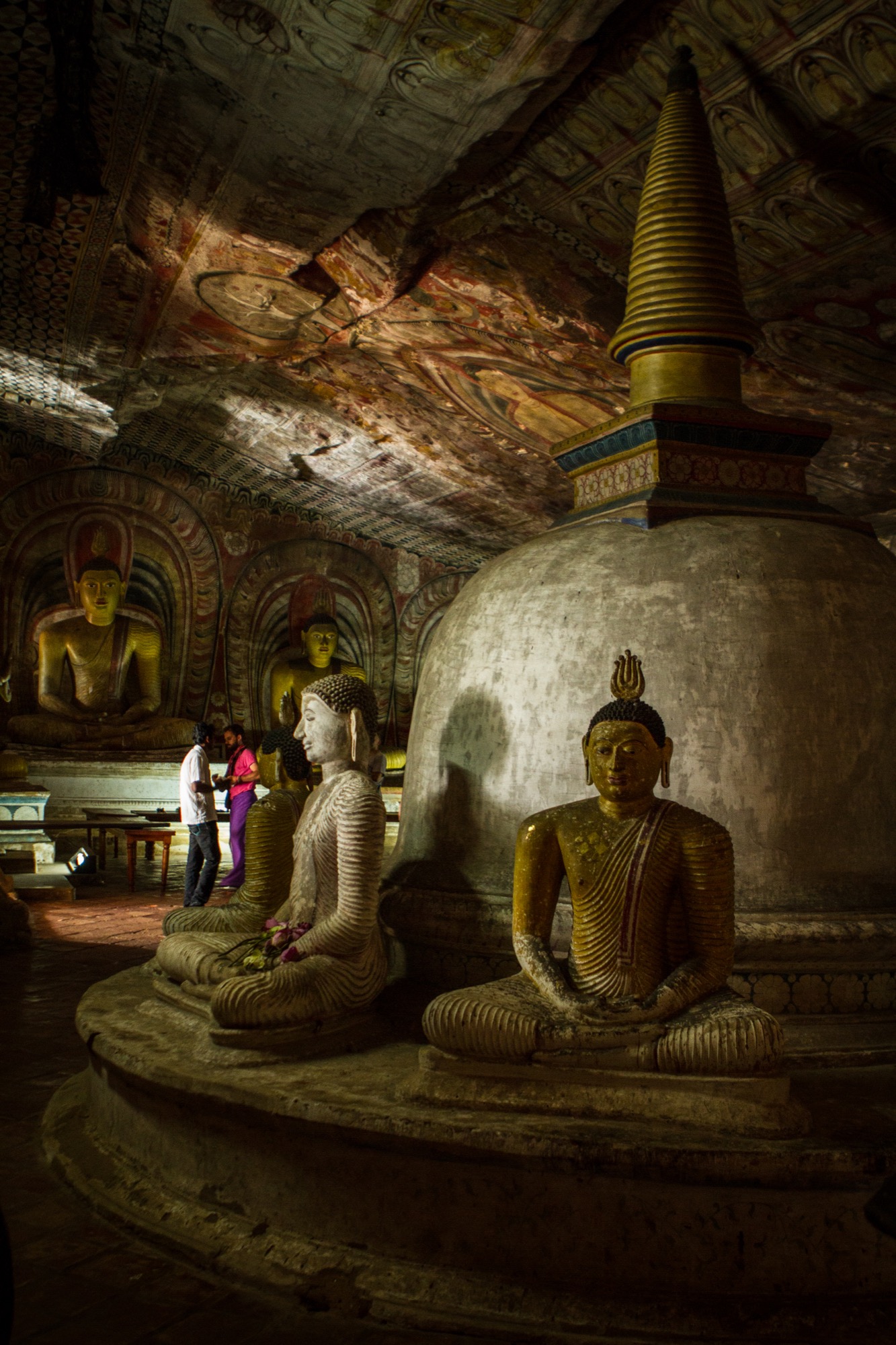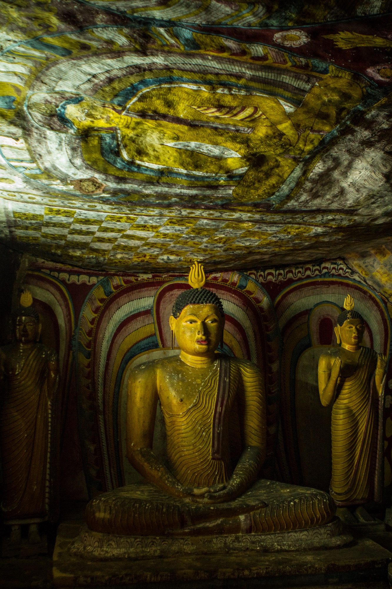 Les grottes d’Or, enfin. On pénètre bien évidemment pieds nus dans la zone principale du temple. Les grottes, fondées par un roi déchu qui s’y était réfugié avant d’être restauré, sont antérieures à l’ère chrétienne, en 104 av. J-C ! Il y en a plusieurs dizaines mais on n’en visite que cinq, les plus grandes et impressionnantes. Les statues de Bouddha se comptent par dizaines dans chacune des salles. Murs et plafonds sont couverts de fresques de toute beauté.