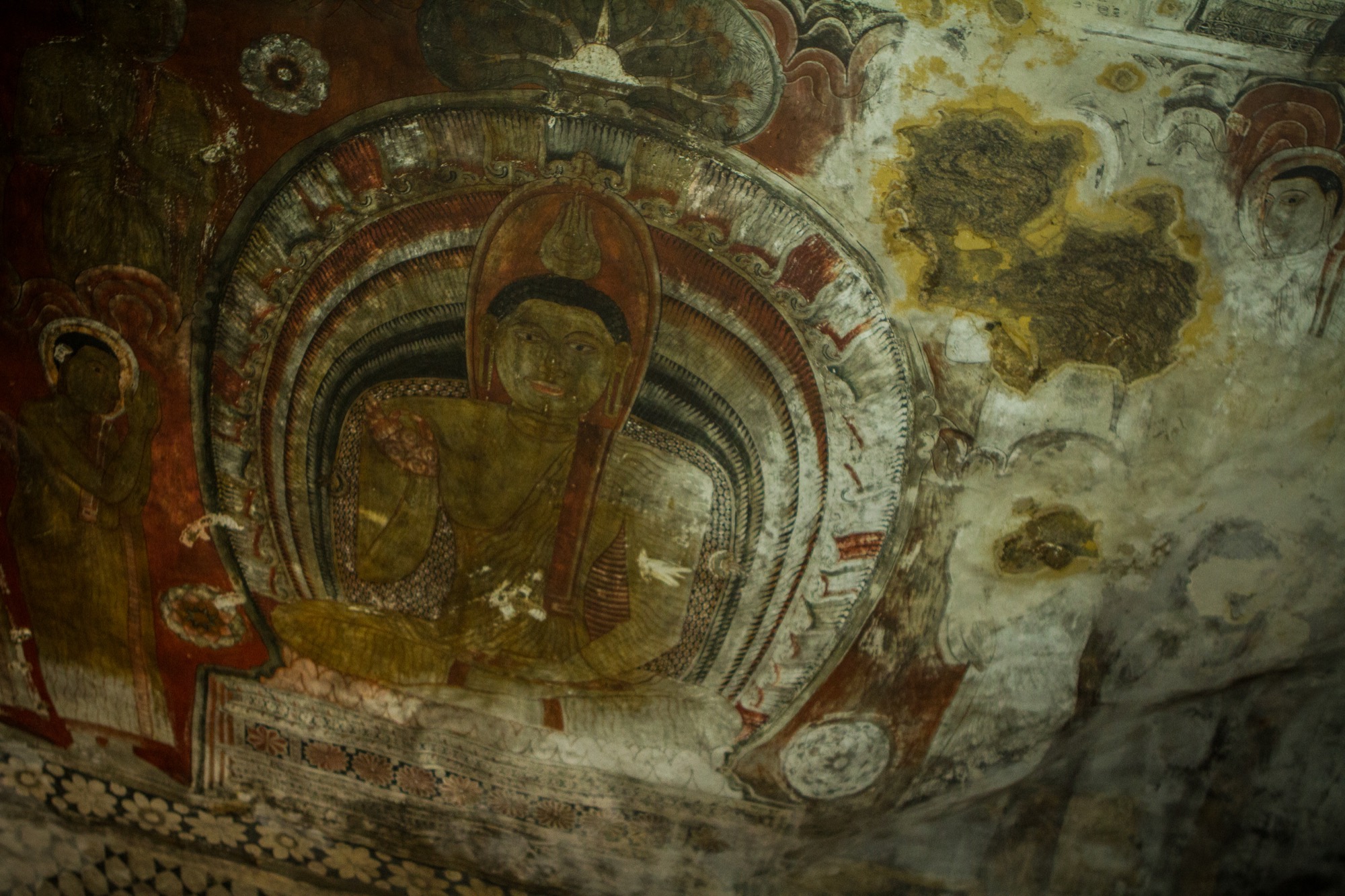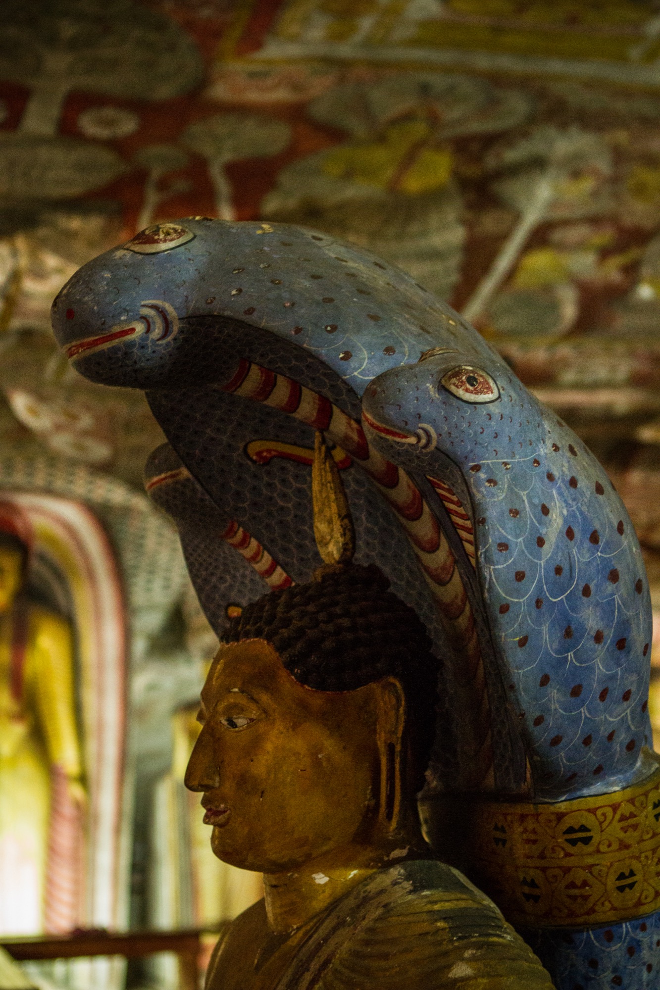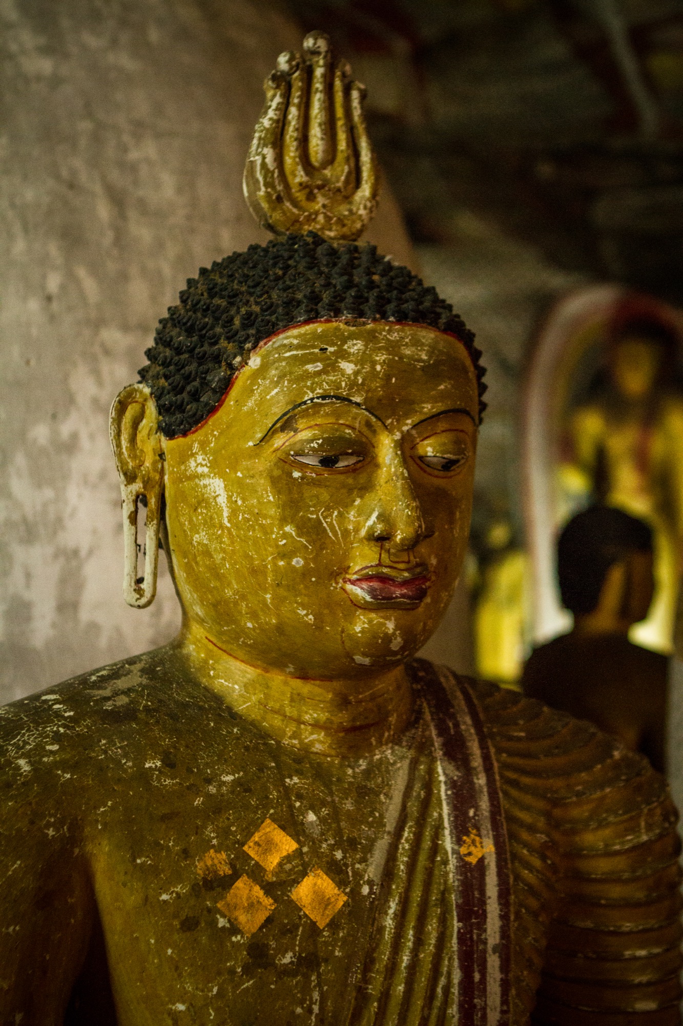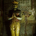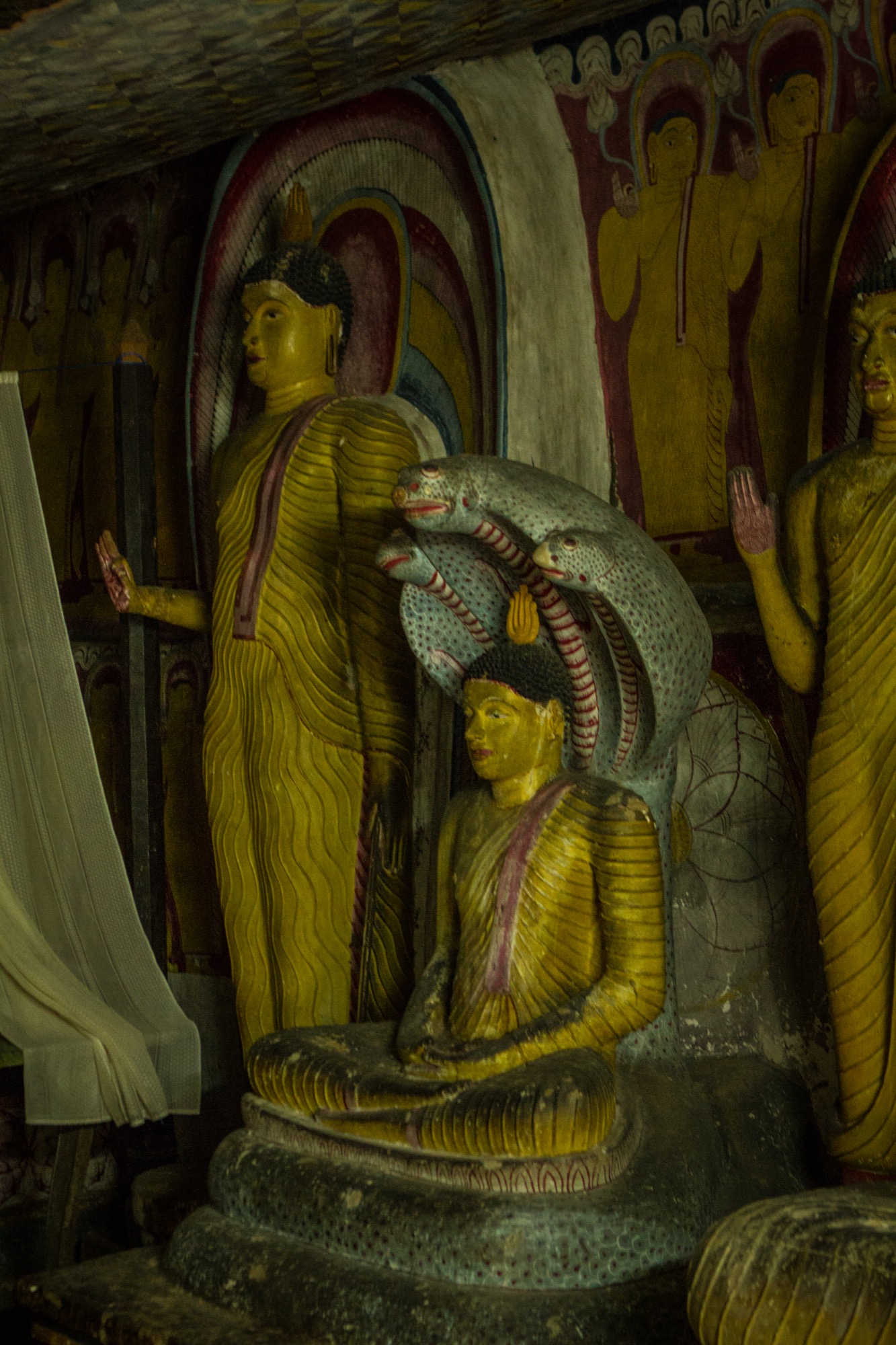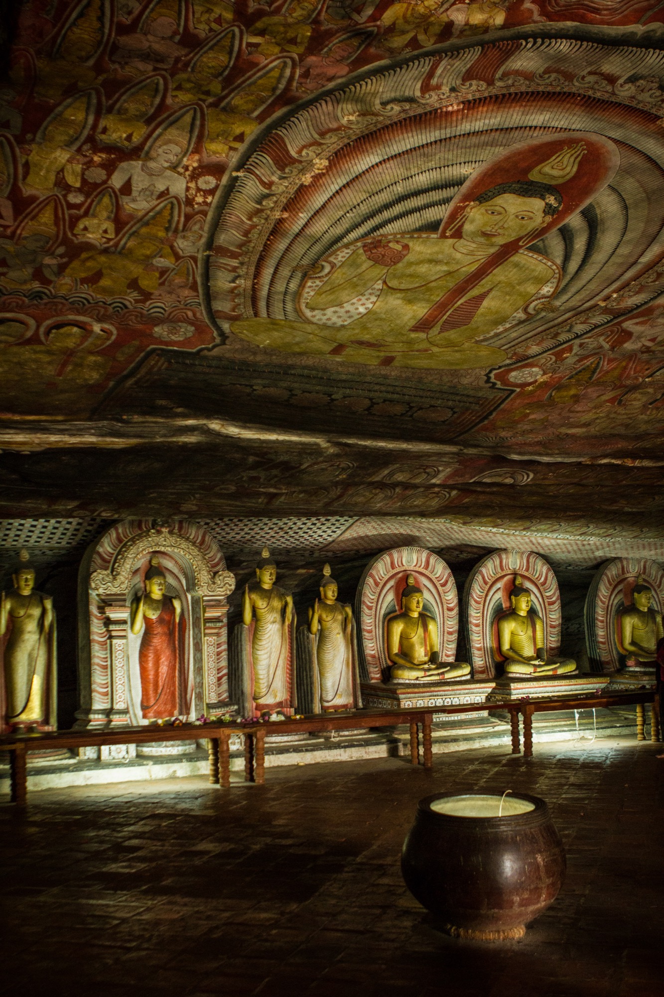 Les grottes d’Or, enfin. On pénètre bien évidemment pieds nus dans la zone principale du temple. Les grottes, fondées par un roi déchu qui s’y était réfugié avant d’être restauré, sont antérieures à l’ère chrétienne, en 104 av. J-C ! Il y en a plusieurs dizaines mais on n’en visite que cinq, les plus grandes et impressionnantes. Les statues de Bouddha se comptent par dizaines dans chacune des salles. Murs et plafonds sont couverts de fresques de toute beauté.
