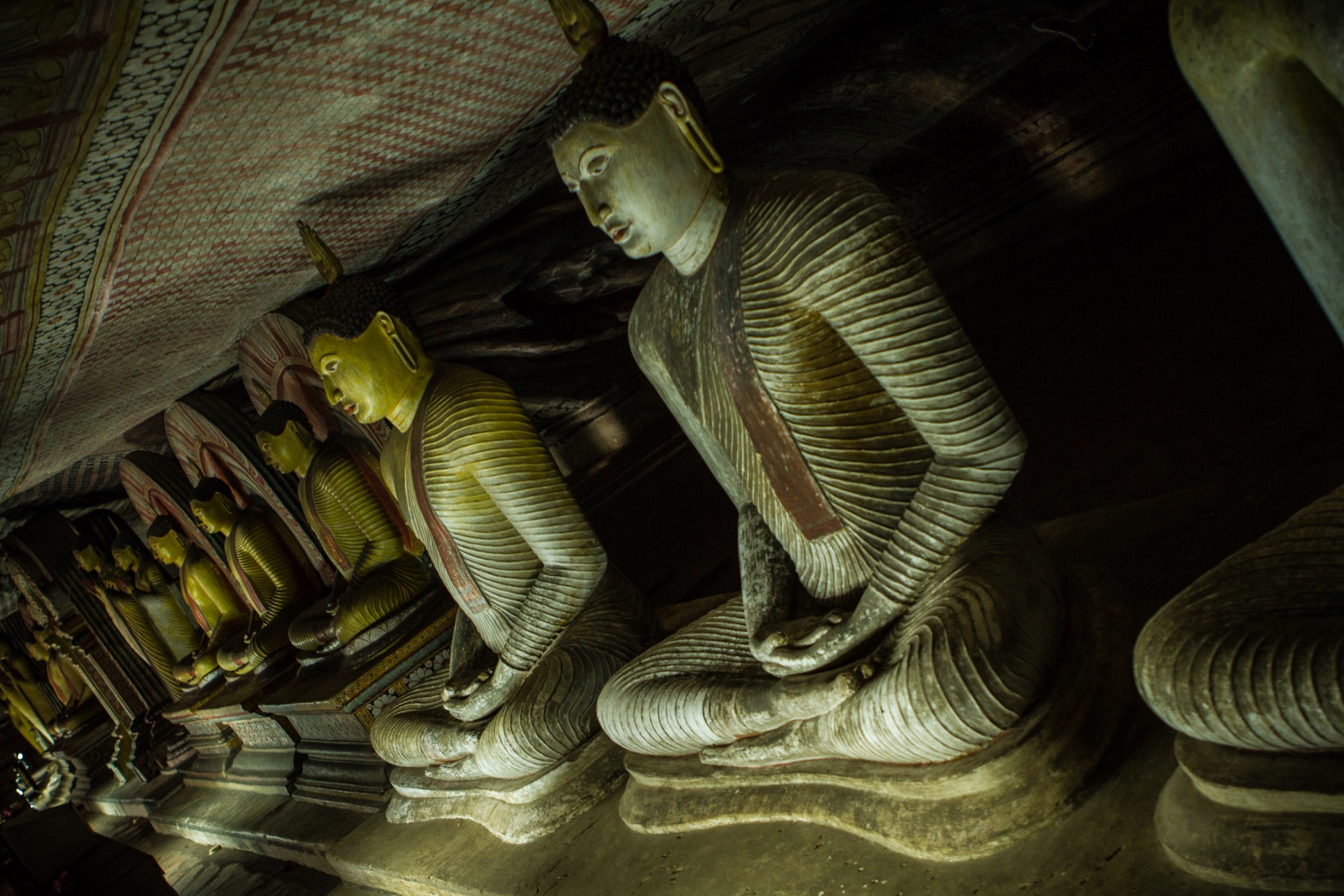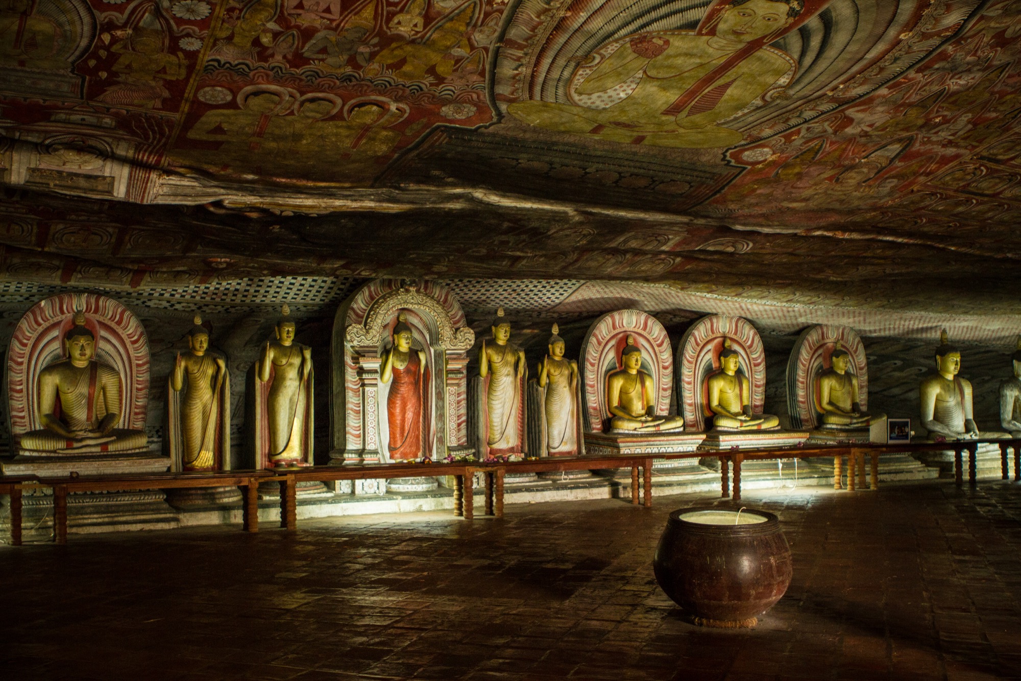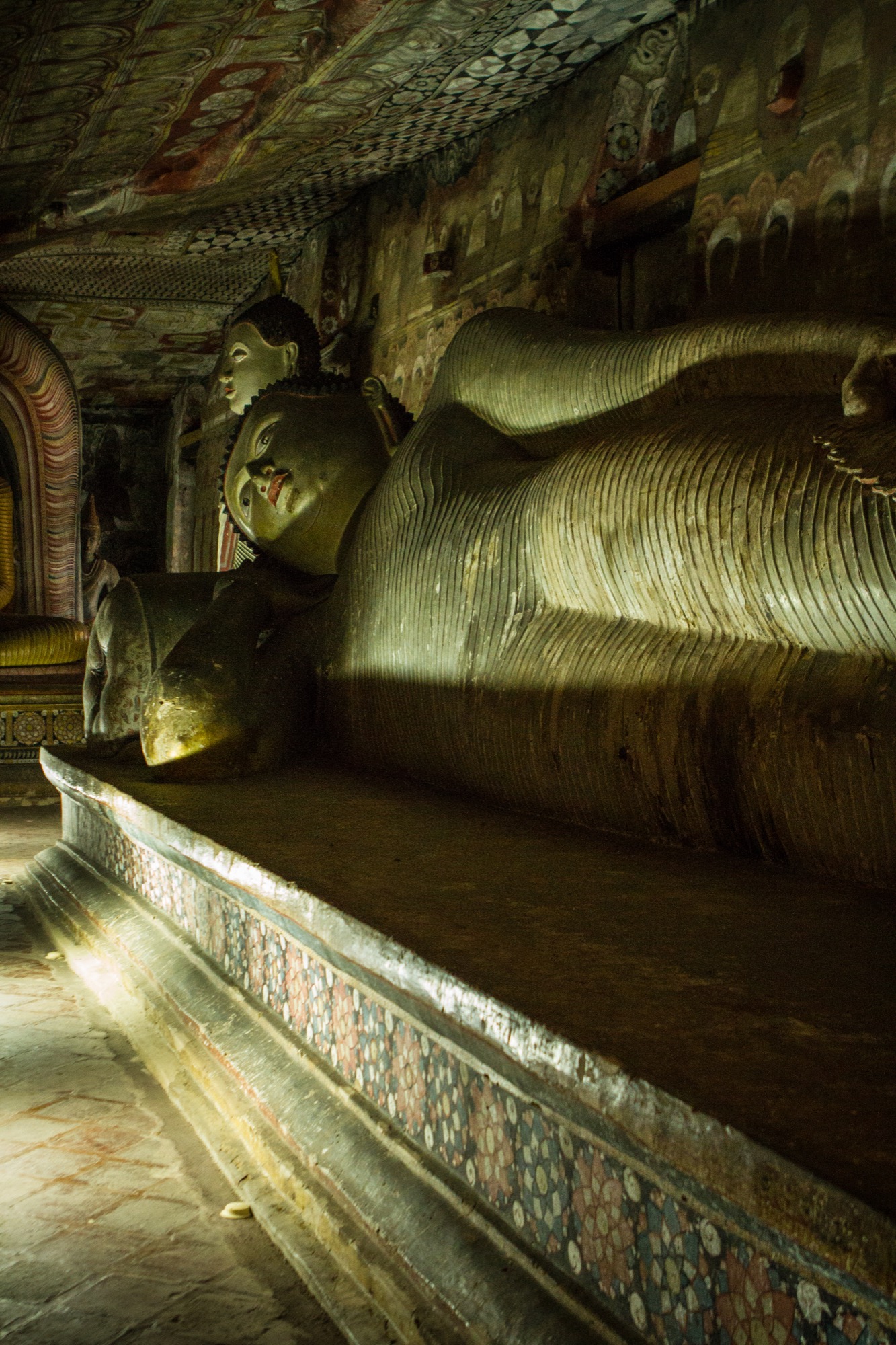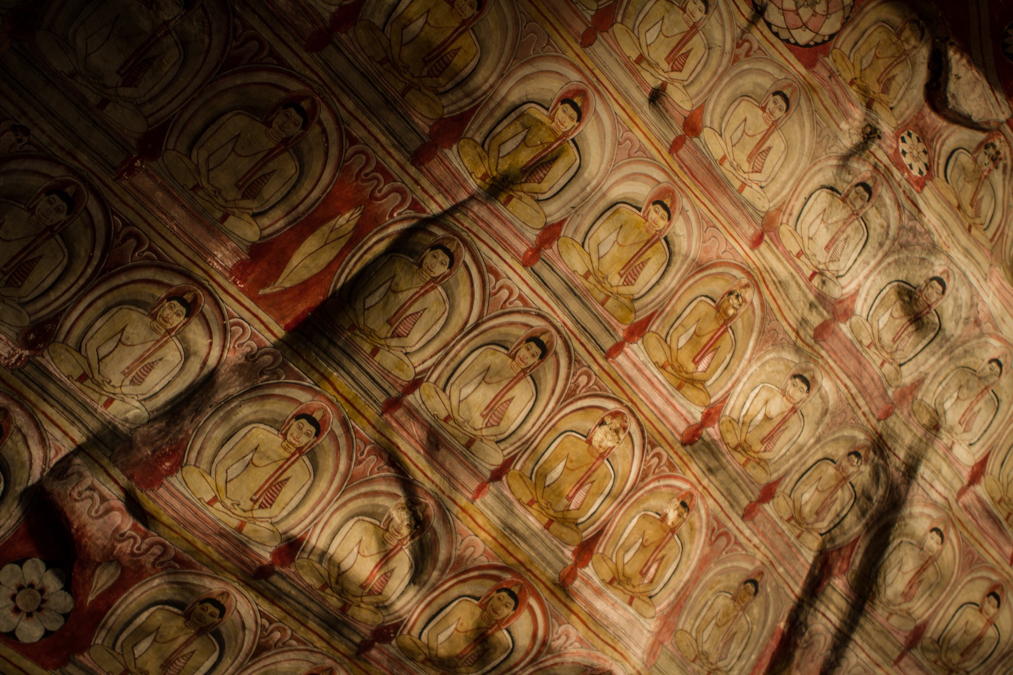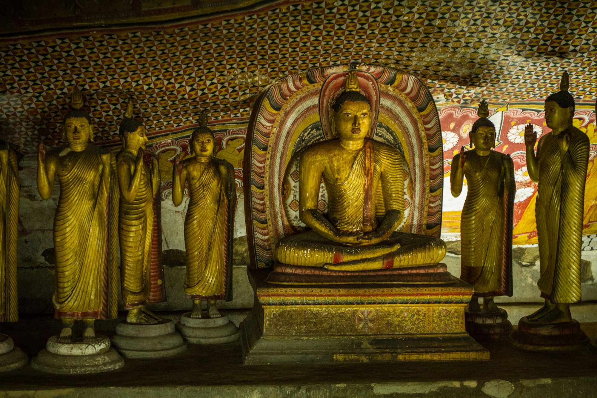 Les grottes d’Or, enfin. On pénètre bien évidemment pieds nus dans la zone principale du temple. Les grottes, fondées par un roi déchu qui s’y était réfugié avant d’être restauré, sont antérieures à l’ère chrétienne, en 104 av. J-C ! Il y en a plusieurs dizaines mais on n’en visite que cinq, les plus grandes et impressionnantes. Les statues de Bouddha se comptent par dizaines dans chacune des salles. Murs et plafonds sont couverts de fresques de toute beauté.