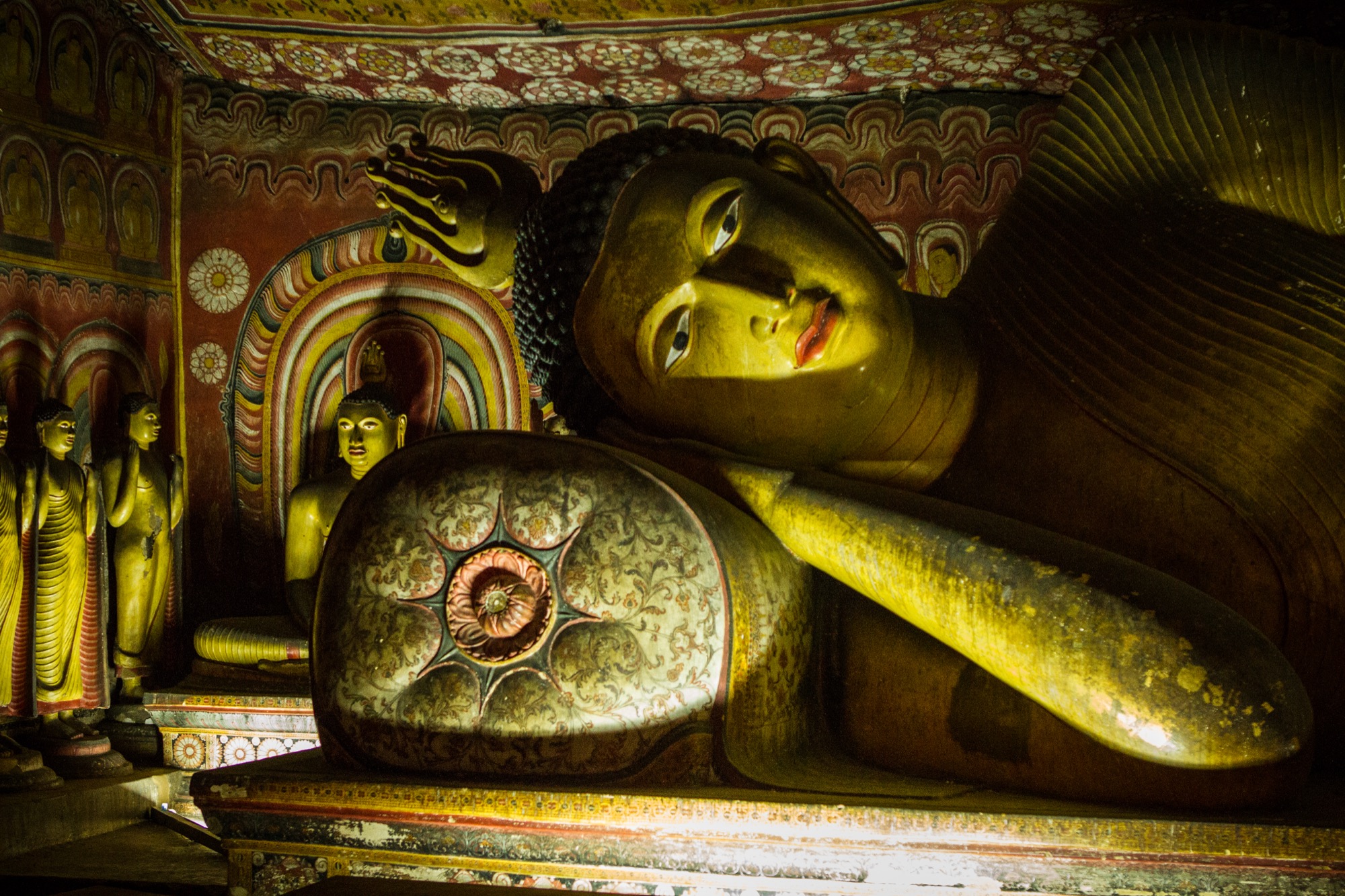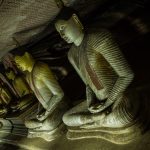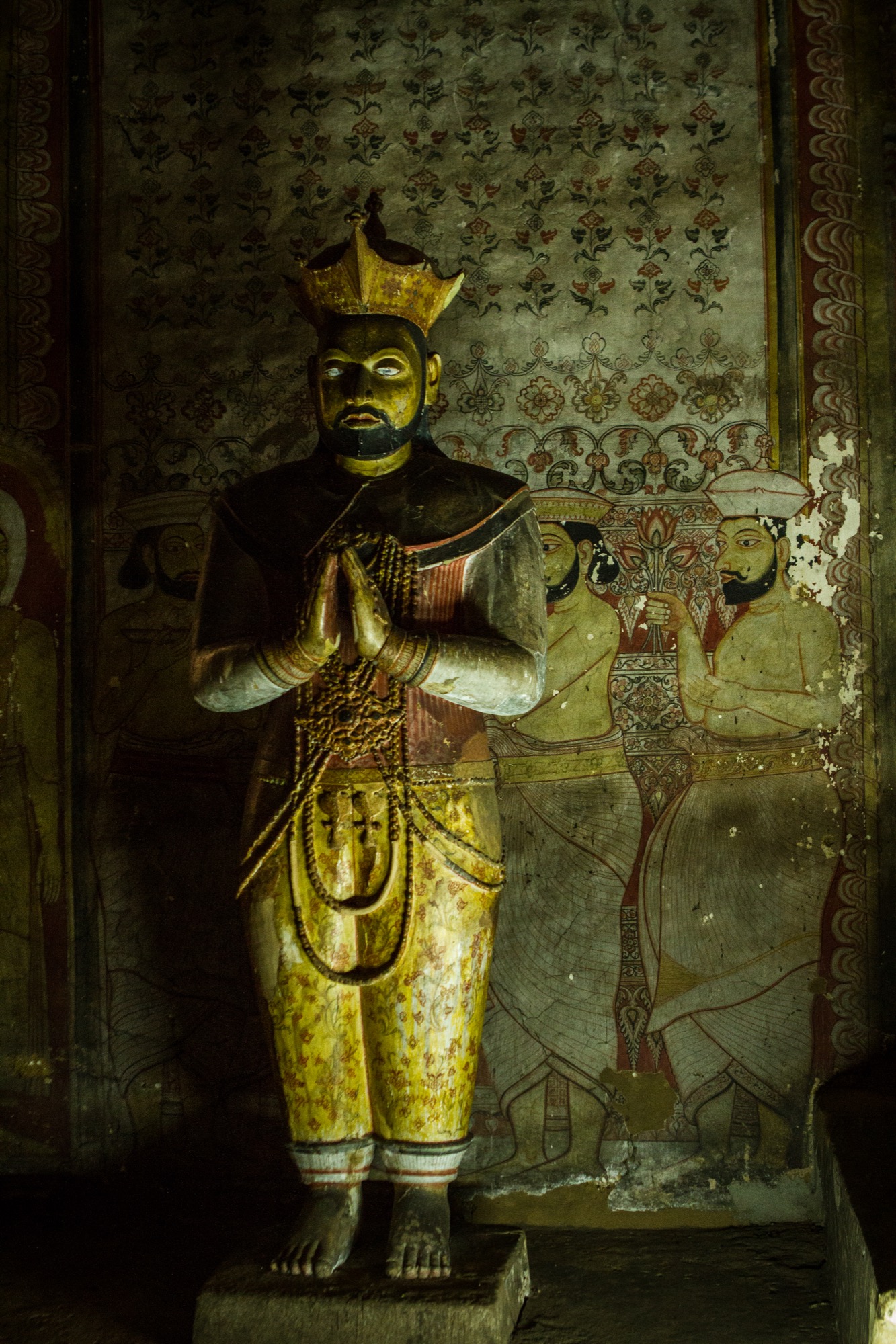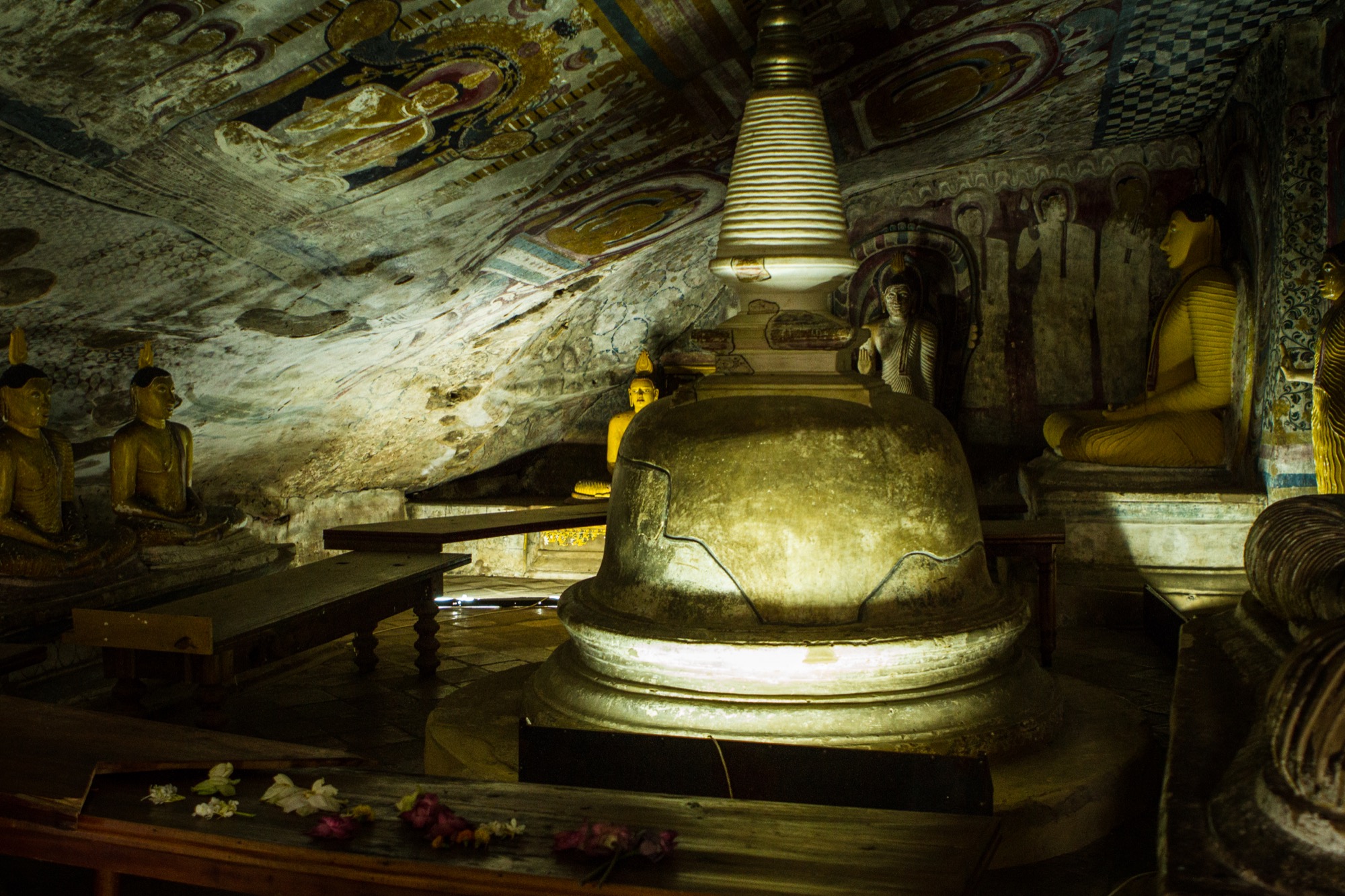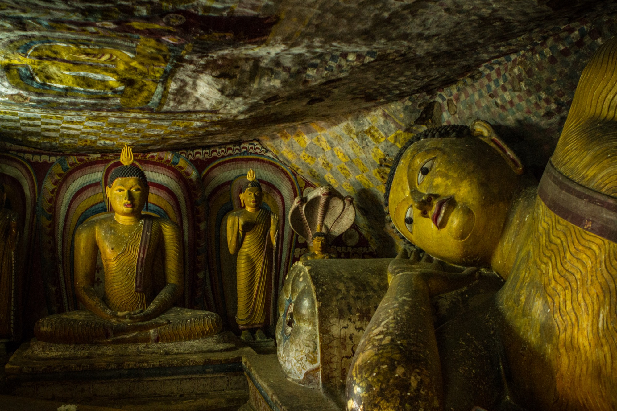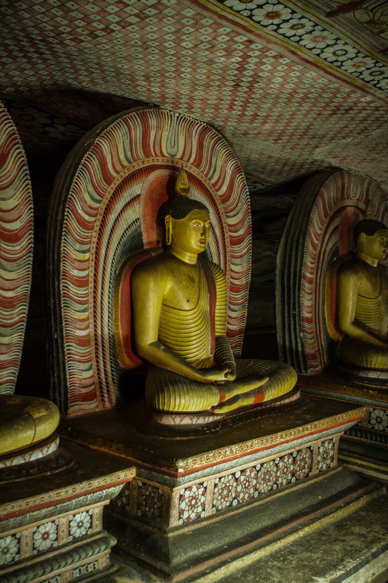 Les grottes d’Or, enfin. On pénètre bien évidemment pieds nus dans la zone principale du temple. Les grottes, fondées par un roi déchu qui s’y était réfugié avant d’être restauré, sont antérieures à l’ère chrétienne, en 104 av. J-C ! Il y en a plusieurs dizaines mais on n’en visite que cinq, les plus grandes et impressionnantes. Les statues de Bouddha se comptent par dizaines dans chacune des salles. Murs et plafonds sont couverts de fresques de toute beauté.