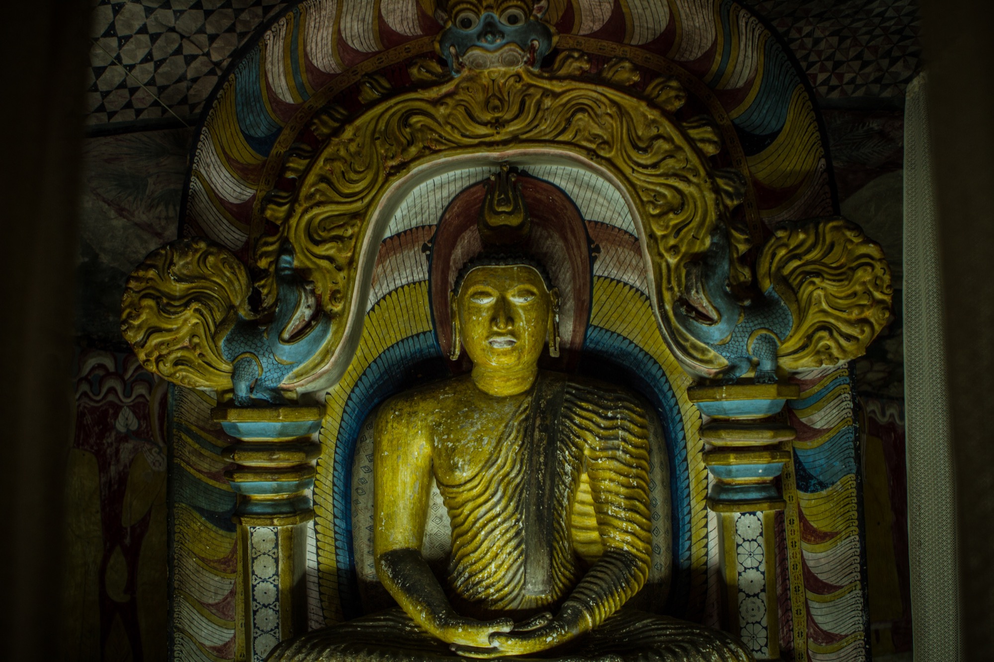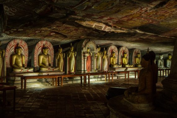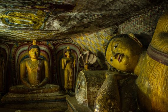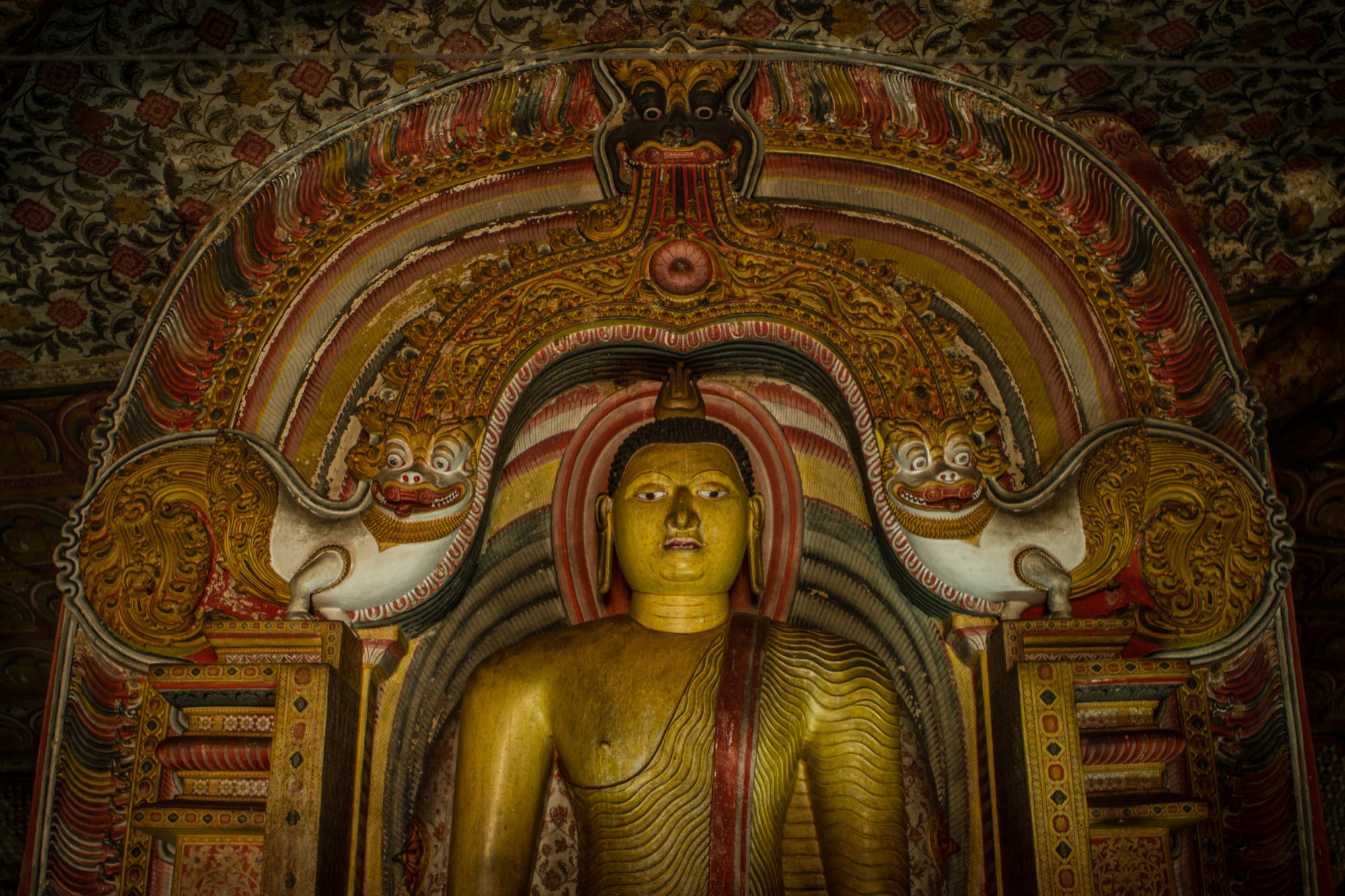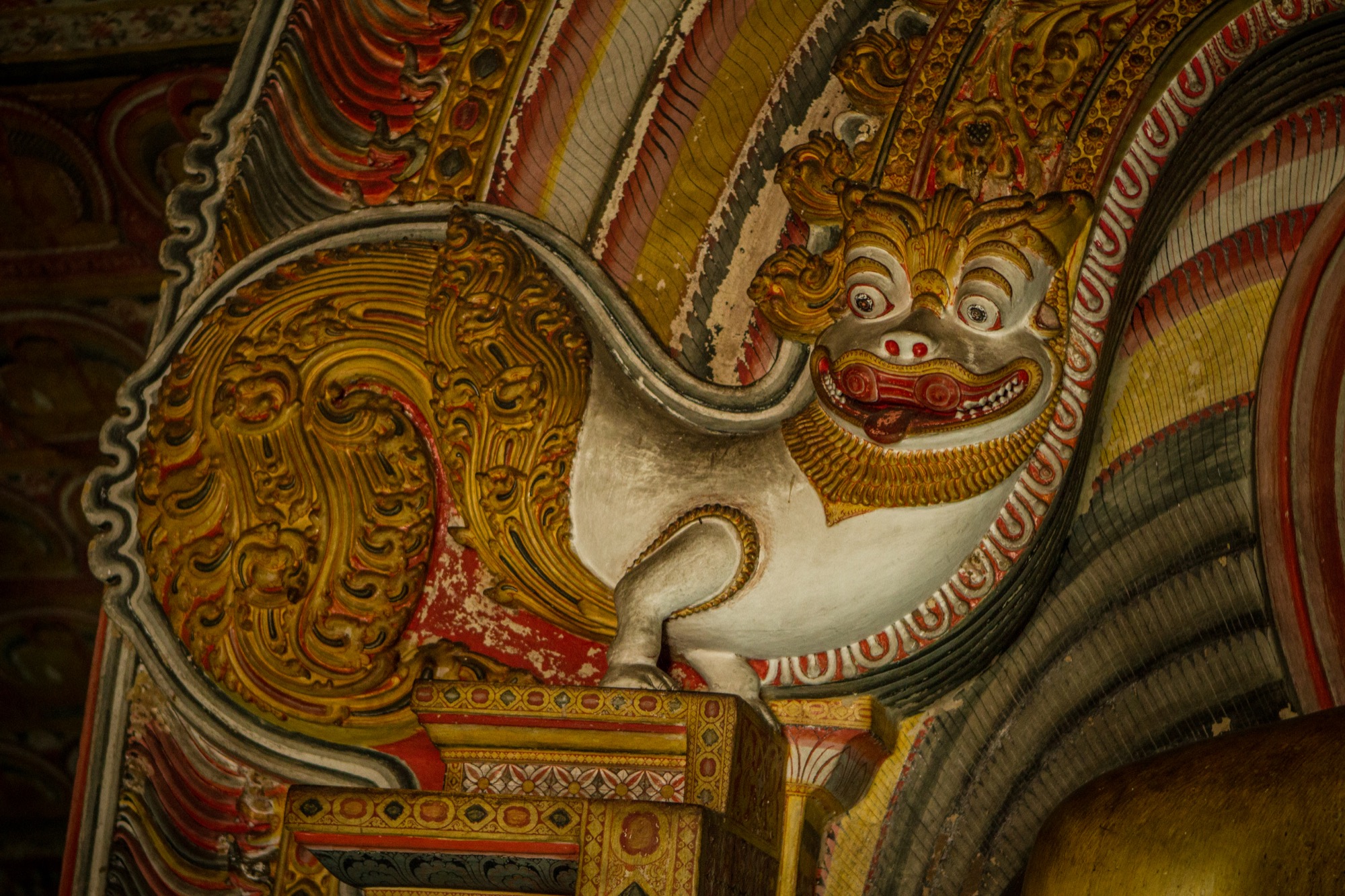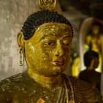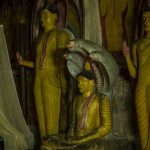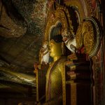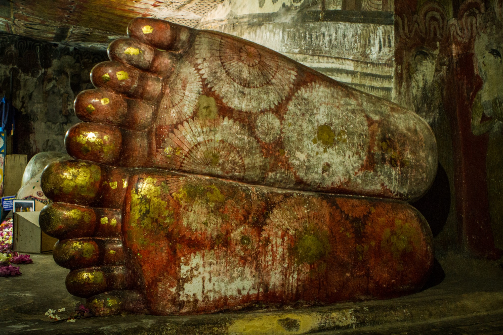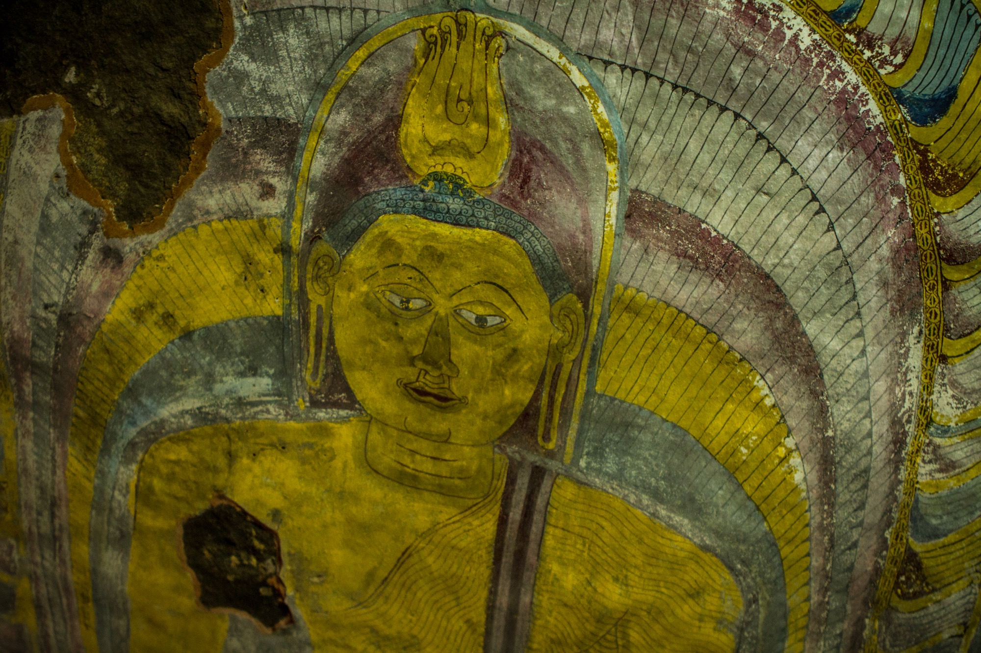 Les grottes d’Or, enfin. On pénètre bien évidemment pieds nus dans la zone principale du temple. Les grottes, fondées par un roi déchu qui s’y était réfugié avant d’être restauré, sont antérieures à l’ère chrétienne, en 104 av. J-C ! Il y en a plusieurs dizaines mais on n’en visite que cinq, les plus grandes et impressionnantes. Les statues de Bouddha se comptent par dizaines dans chacune des salles. Murs et plafonds sont couverts de fresques de toute beauté.