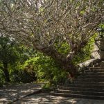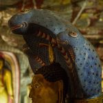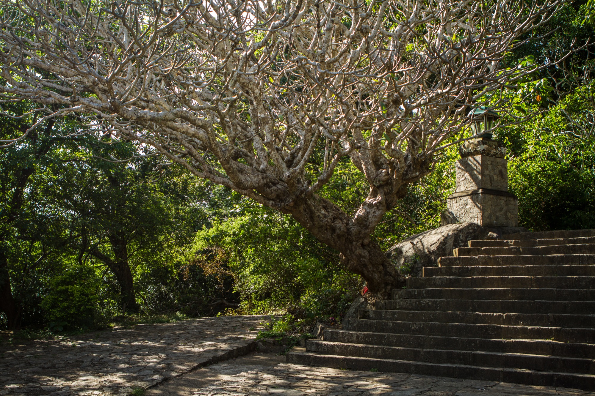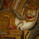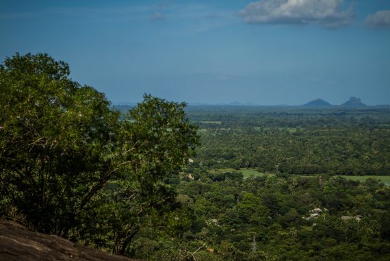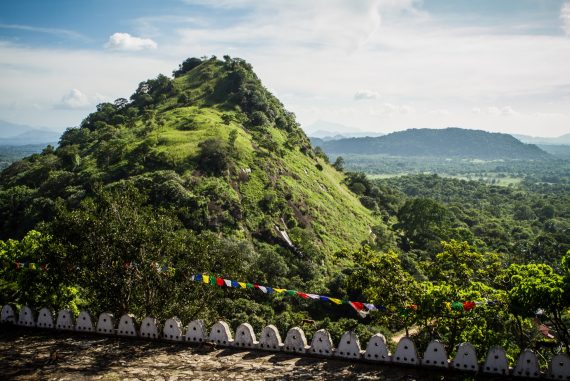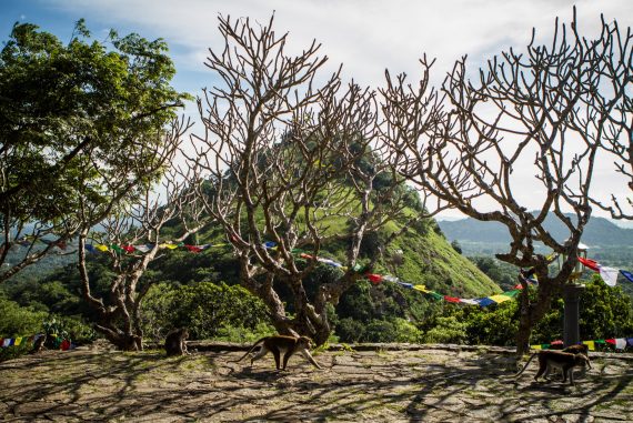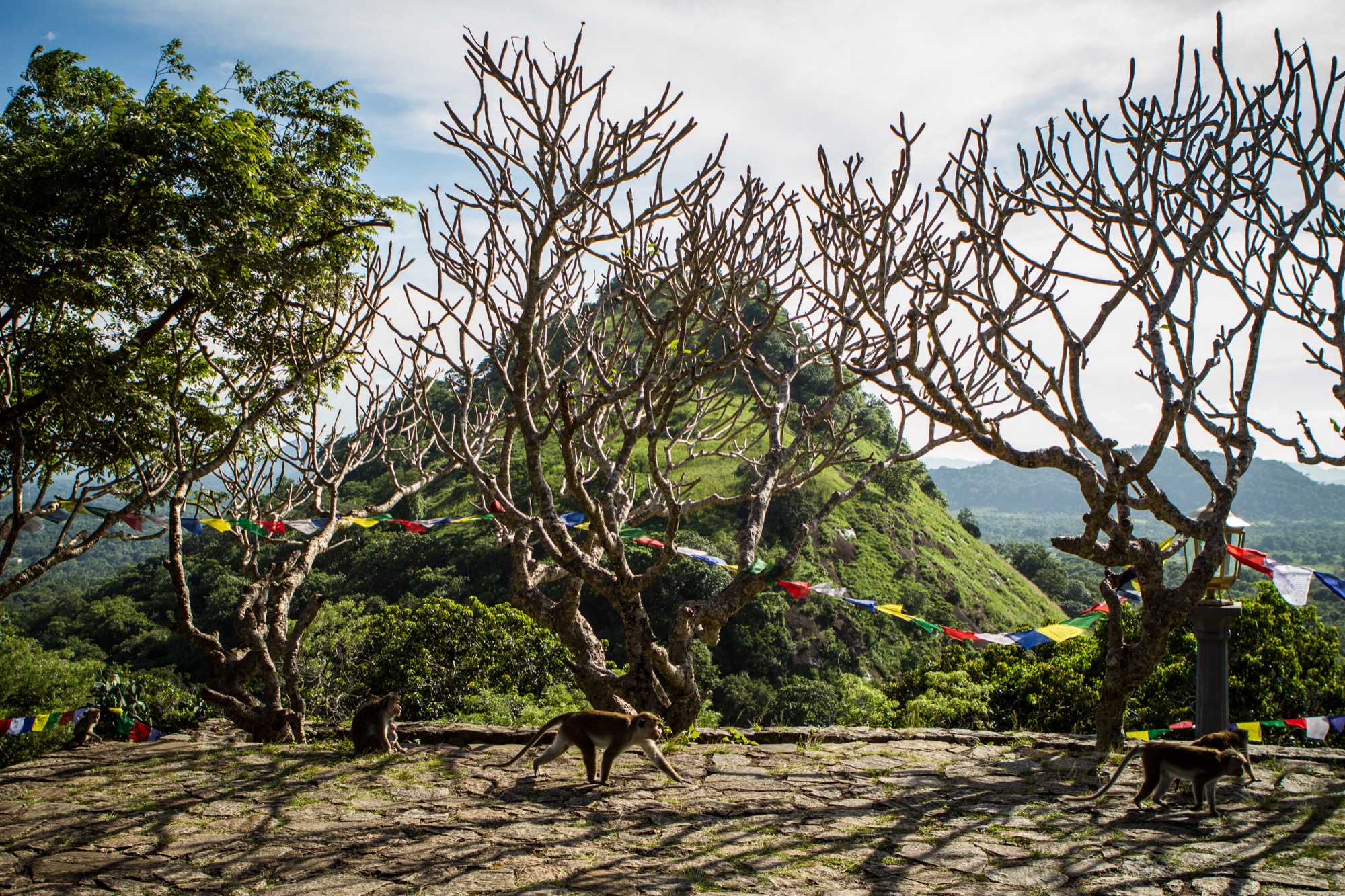 On grimpe quelques volées de marches. Les grottes sont en effet situées assez haut dans la montagne envahie de cohortes de singes, heureusement tout sauf agressifs tant qu’on les laisse en paix. Ne pas oublier de tourner la tête à droite à un moment de la montée : Sigirîya se découpe à l’horizon, splendide. De l’autre côté, les premiers contreforts et collines de la zone centrale du Sri Lanka. On est à la frontière de la plaine et des montagnes, à Dambulla.