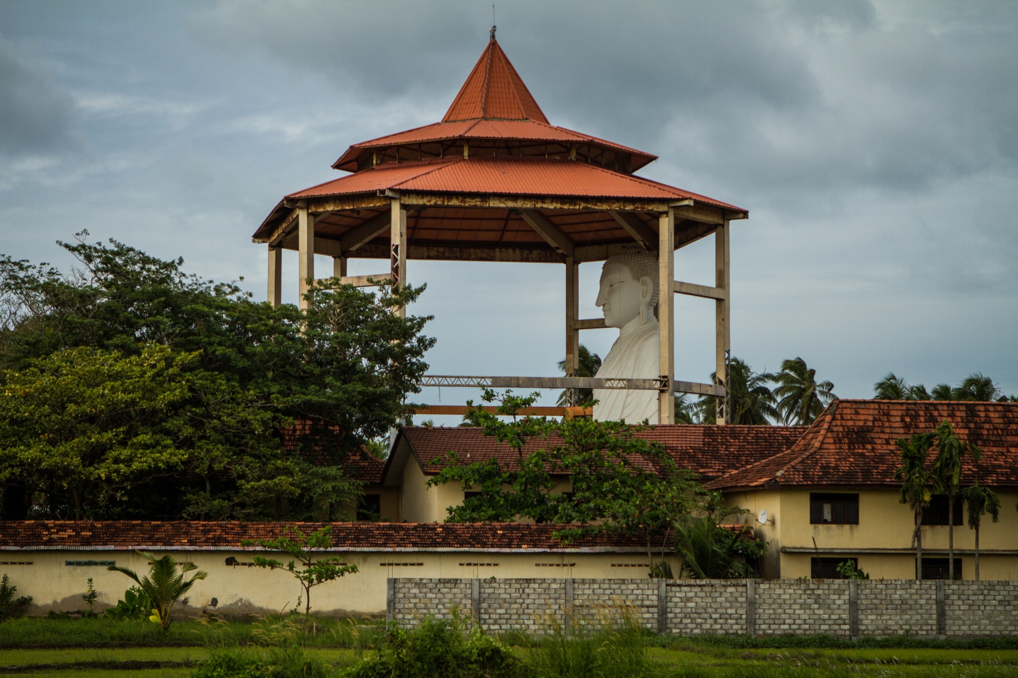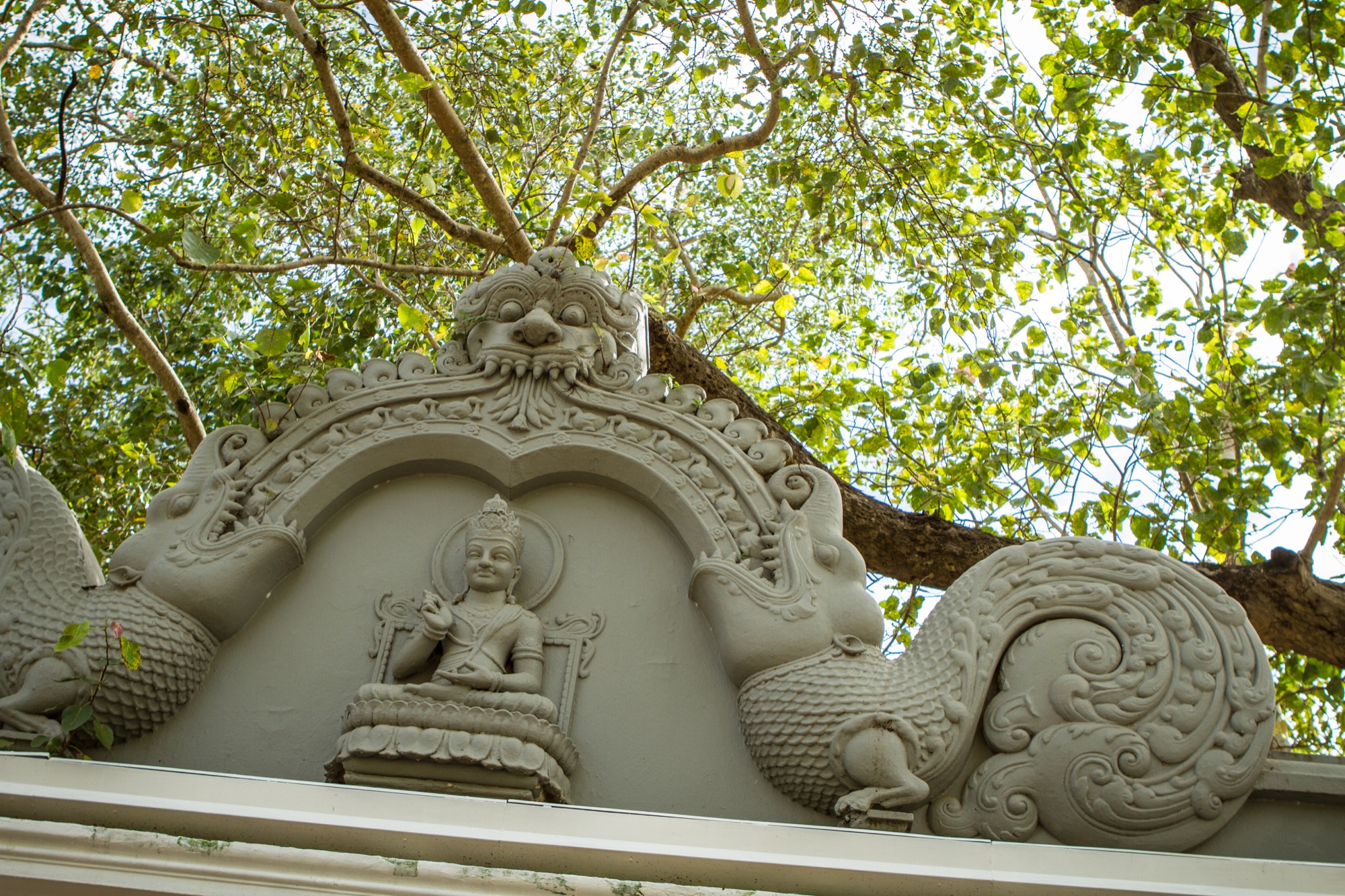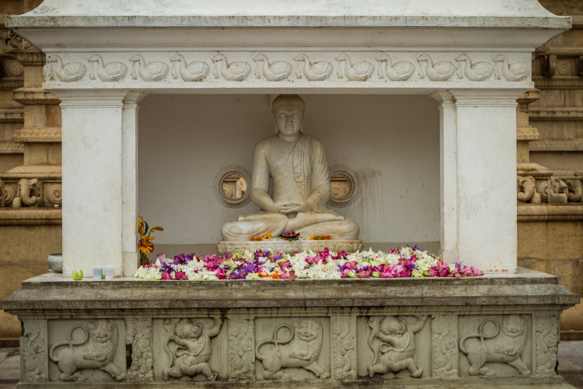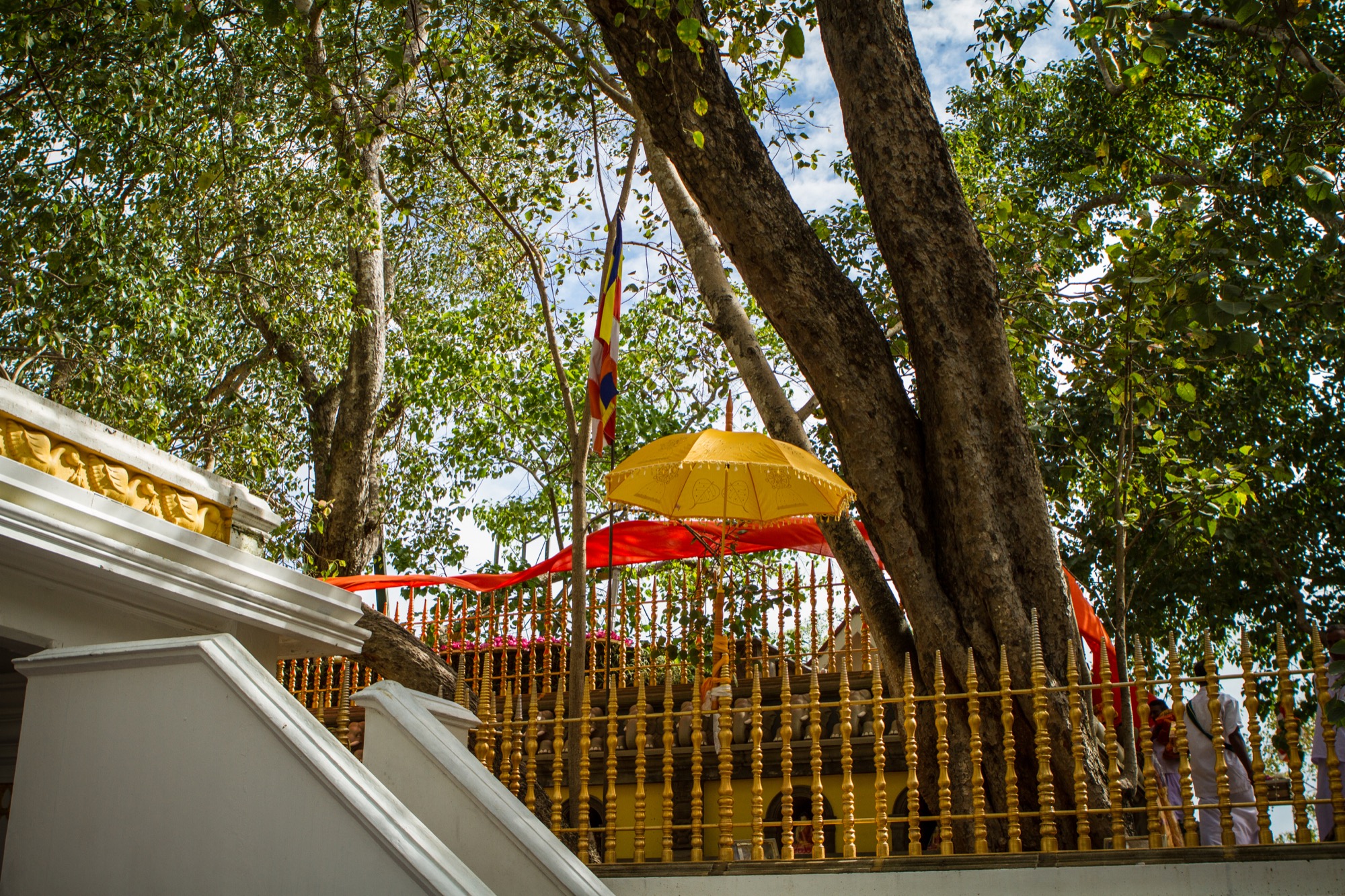 Le premier site visité est un peu à l’écart et est tout à fait exceptionnel. Il s’agit d’un temple abritant une bouture de l’arbre de Bouddha, le Sri Maha Bohdi. Il règne ici une ferveur religieuse impressionnante, émouvante. Pieds nus, je navigue le plus discrètement possible, prenant mes photos le plus discrètement possible aussi, tentant tant bien que mal d’être transparent afin de laisser les fidèles vivre leur foi. Quelle foule ! Odeurs d’encens, de fleurs, d’offrandes, dévotion et sourires, toujours. Je ne repars pas tout à fait indemne de ce lieu, frappé par cette dévotion et par la présence de cette fameuse branche soutenue d’or.