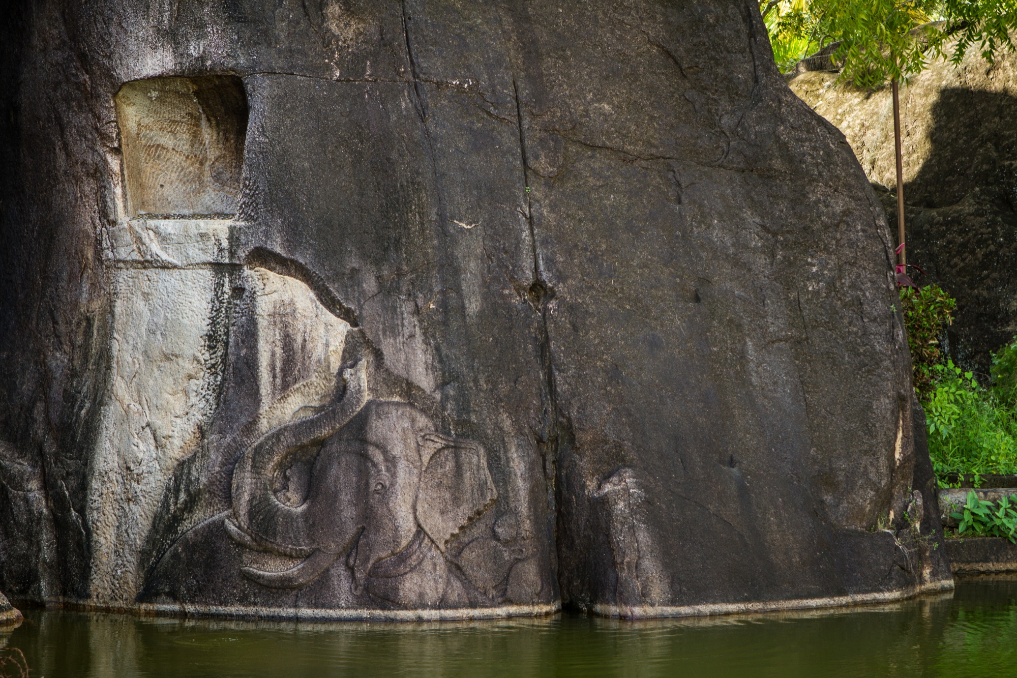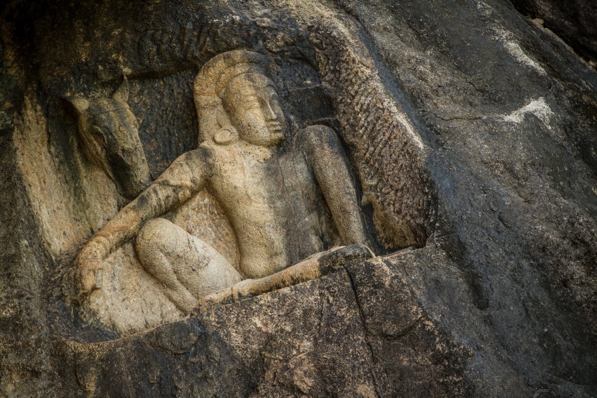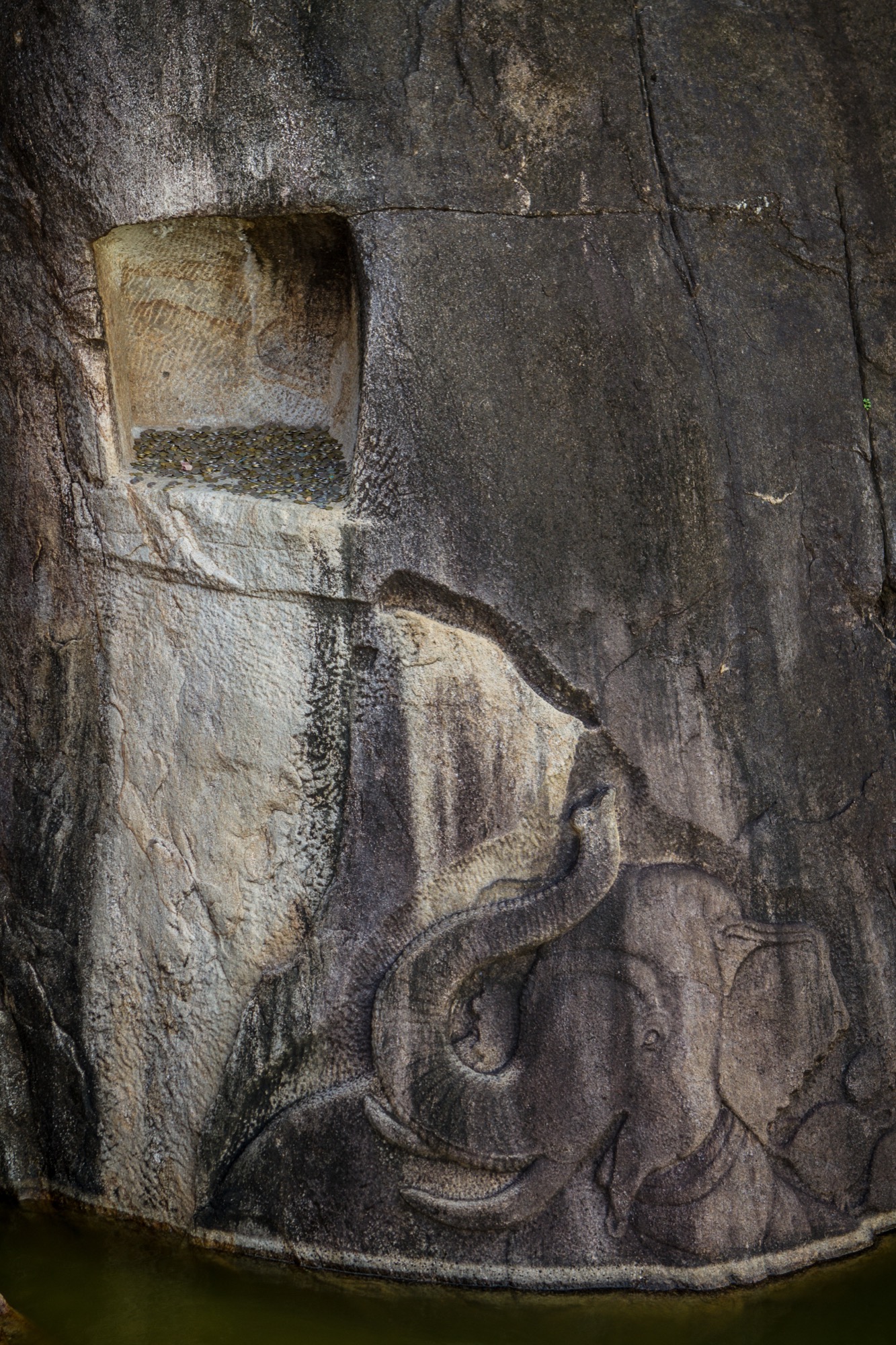 En fait, pour avoir un peu de changement, il faut repartir vers le lac de Tissa Wewa et le longer vers le sud. On peut alors rejoindre au prix de quelques embranchements un autre temple très important de Anuradhapura, bien différent des autres et donc source d’une certaine fraîcheur en cette fin de journée. Il s’agit du temple d’Isurumuniya, avec son splendide bassin et surtout ses figures sculptées dans la roche, dont l’une forme un creux dans lequel il est de bon de tenter sa chance en jetant quelques sous.