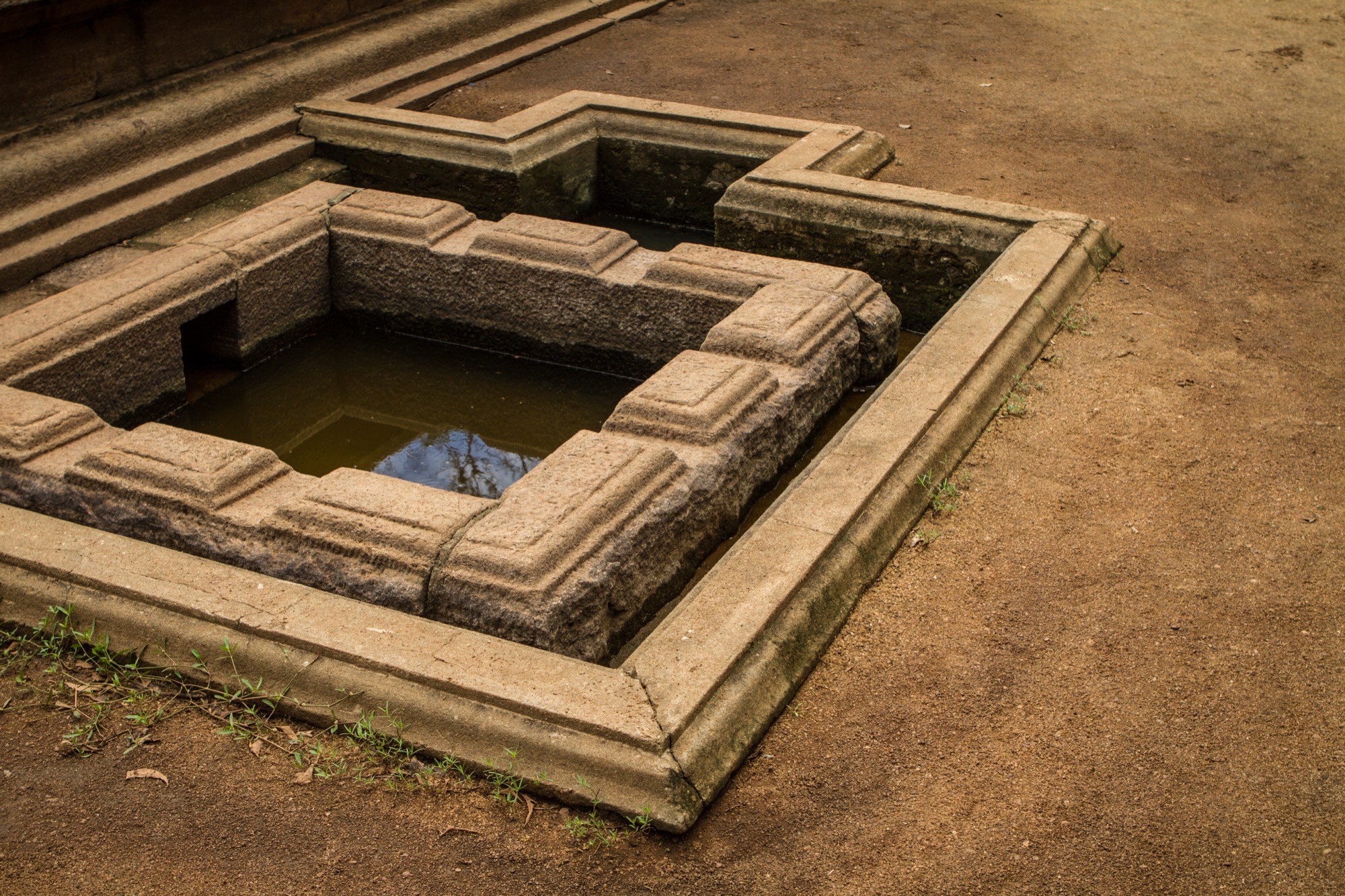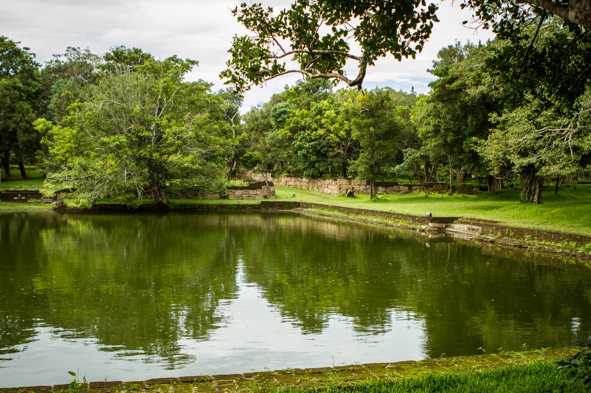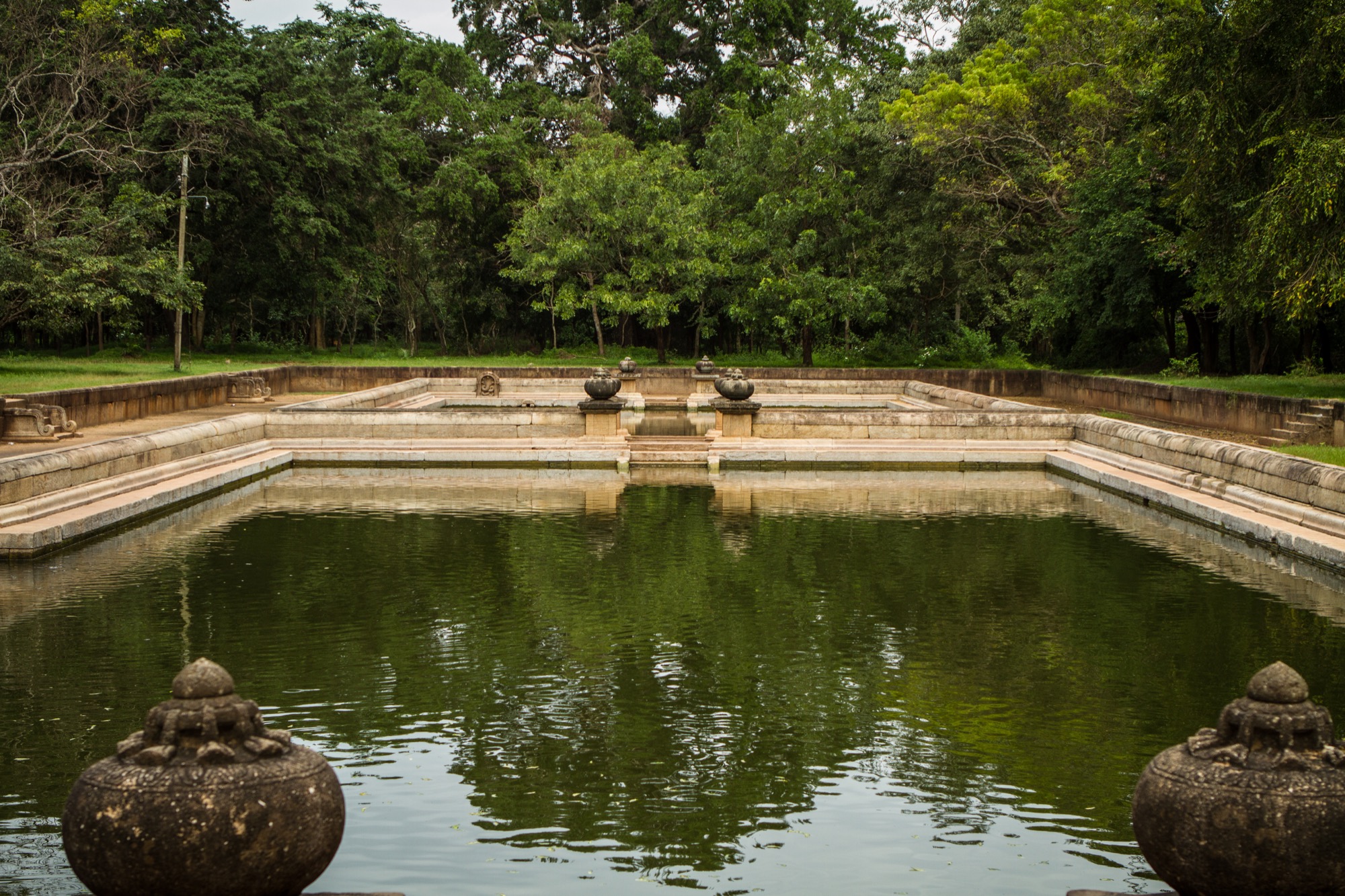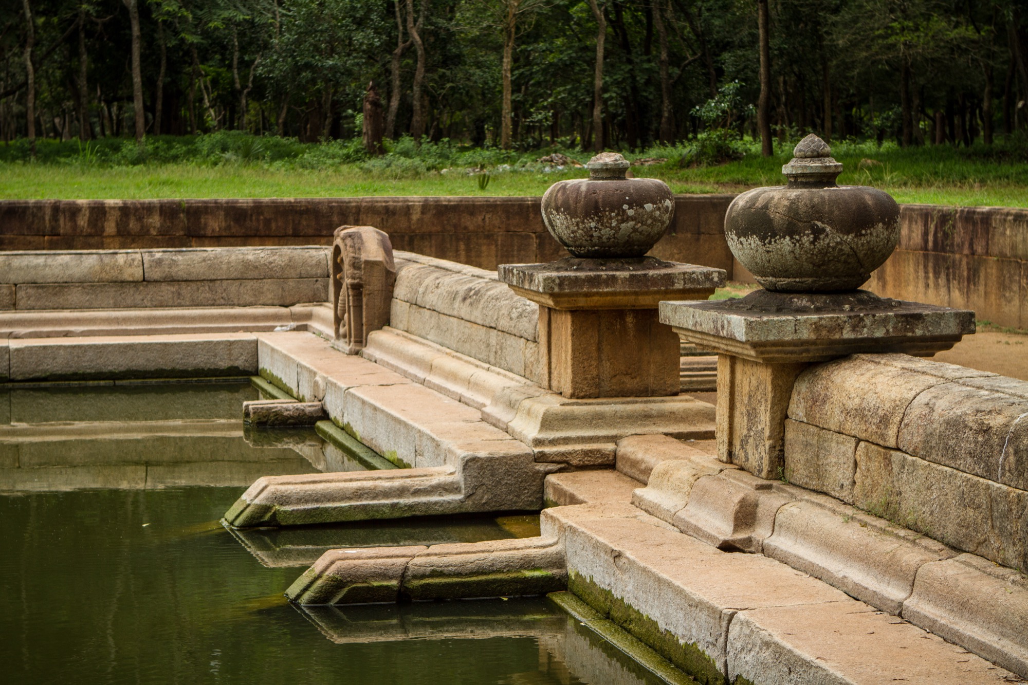Prochaine étape, reprendre la route en passant par le centre principal du site afin d’y acheter les tickets qui seront contrôlés de manière systématique aux différents postes de garde. Je fais le choix de faire le tour dans le sens anti-horaire. C’est encore assez tôt dans la matinée, la chaleur n’est pas trop violente et surtout, il y a une foule d’arbres pour rendre la balade suffisamment ombragée. Le point suivant est l’un des plus éloignés et au nord de la cité. Il s’agit des bassins jumeaux (Kuttam Pokuna), anciens bains dotés d’un système d’approvisionnement et de filtration de l’eau par gravité, toujours opérationnel aujourd’hui ! L’endroit est très calme, impressionnant quand on considère que les bassins furent construits il y a près de 2000 ans.