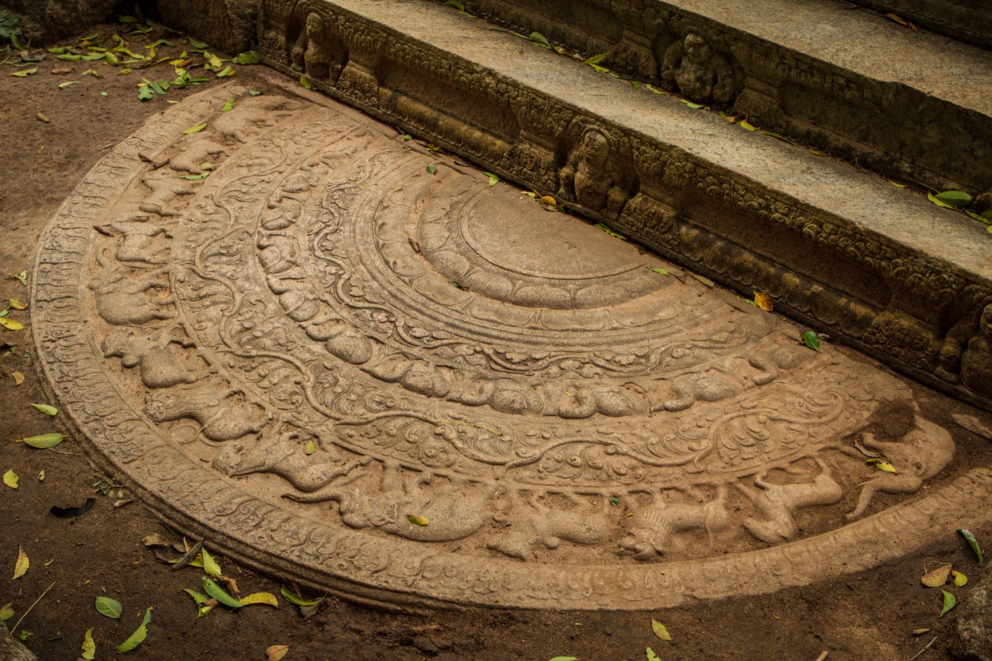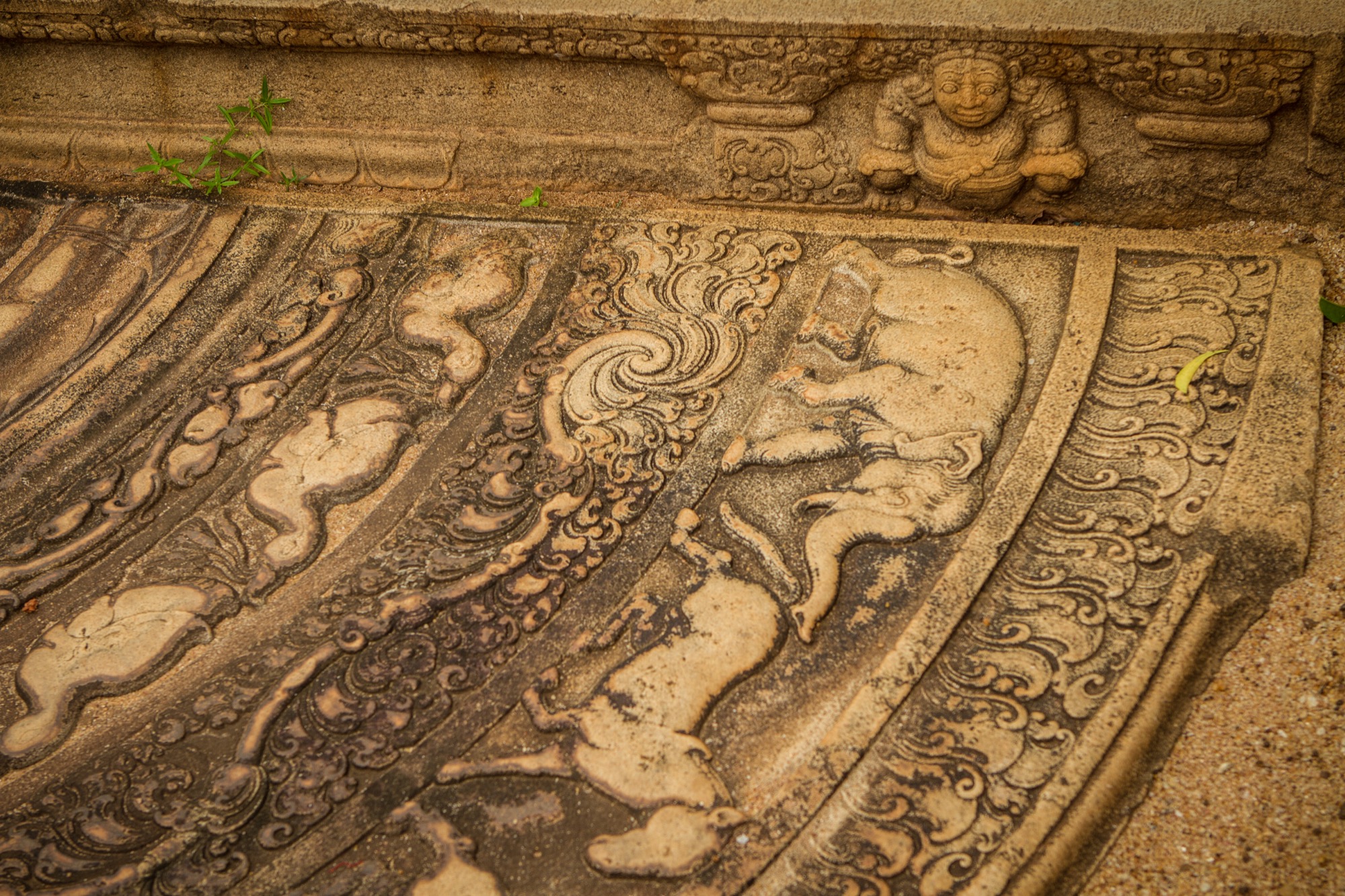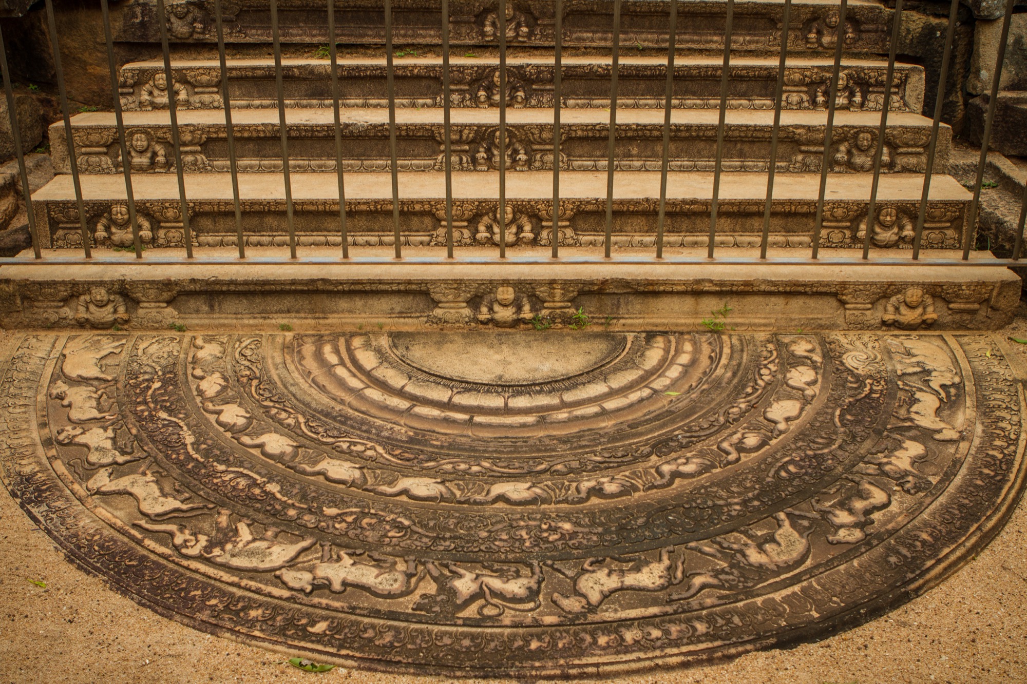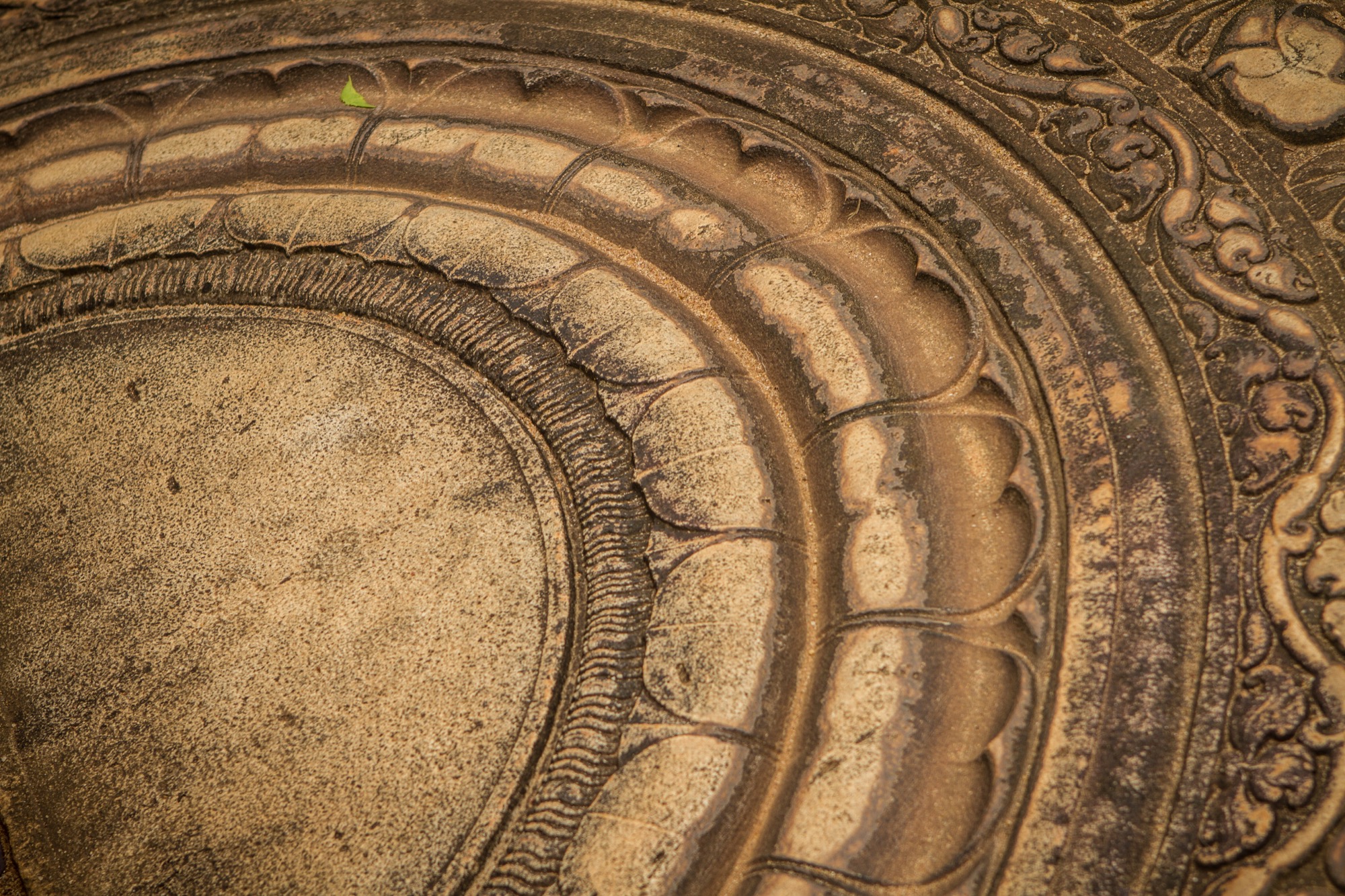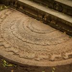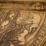 Les deux étapes suivantes sont moins impressionnantes en terme de dimension mais tout aussi importantes pour ce qui de leur rareté et de leur beauté architecturale. Le premier est une pierre de lune marquant l’entrée des ruines d’un temple. Son état de conservation est absolument remarquable et retrace parfaitement les différents cercles et symboles du parcours bouddhiste menant au nirvana, au centre de la pierre. Splendide.