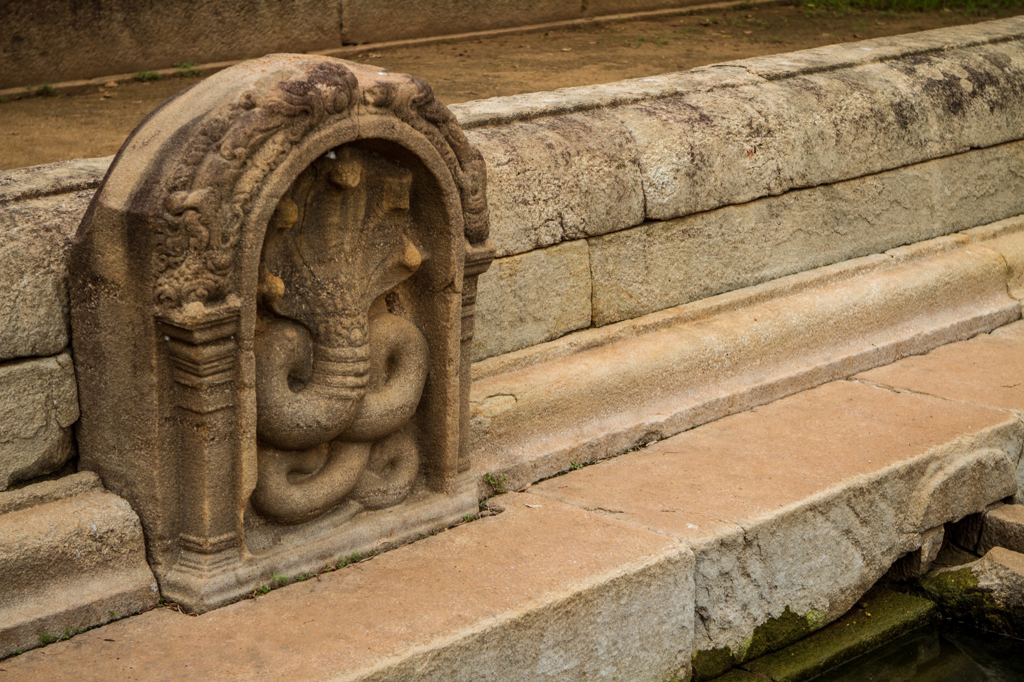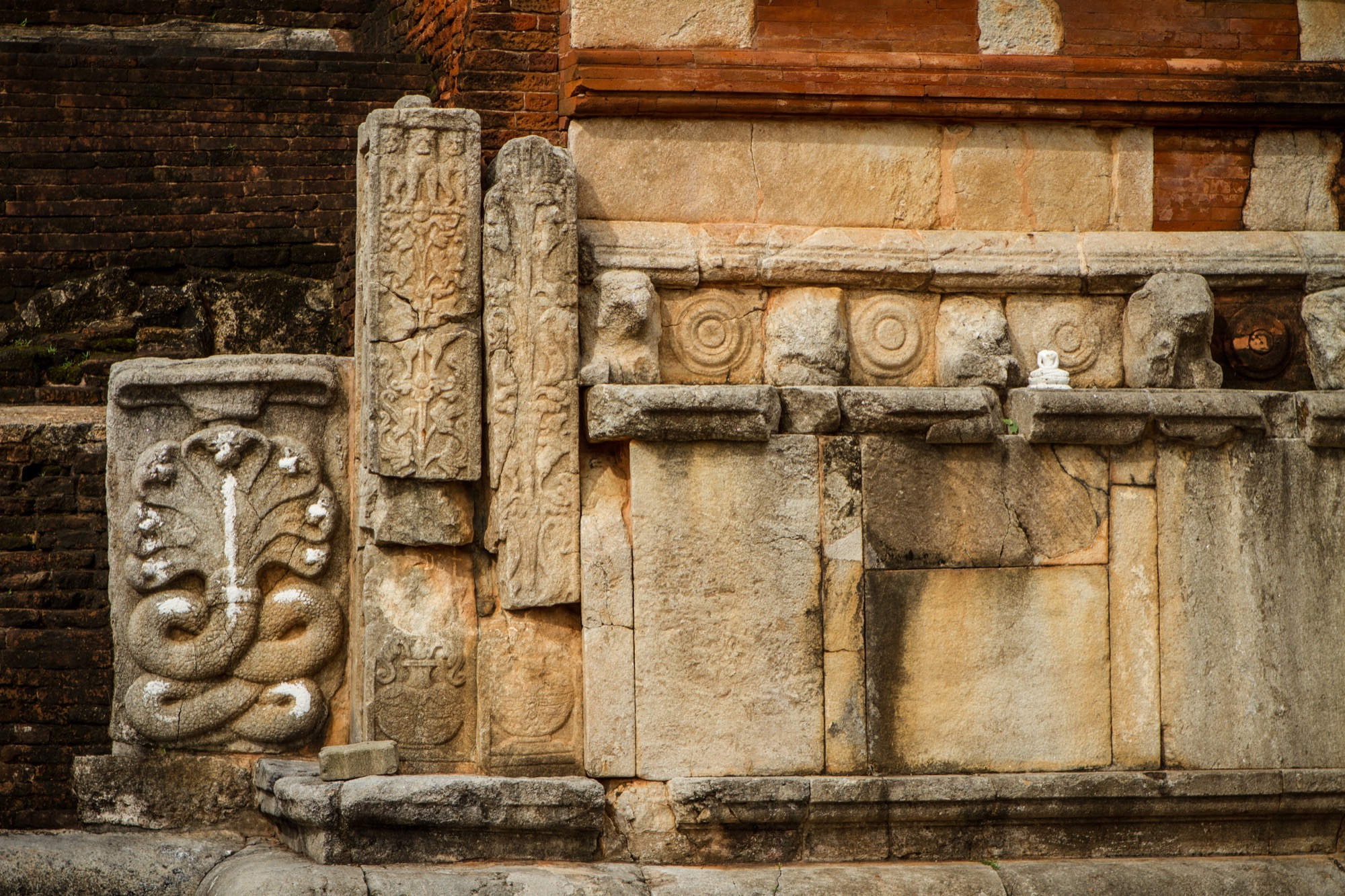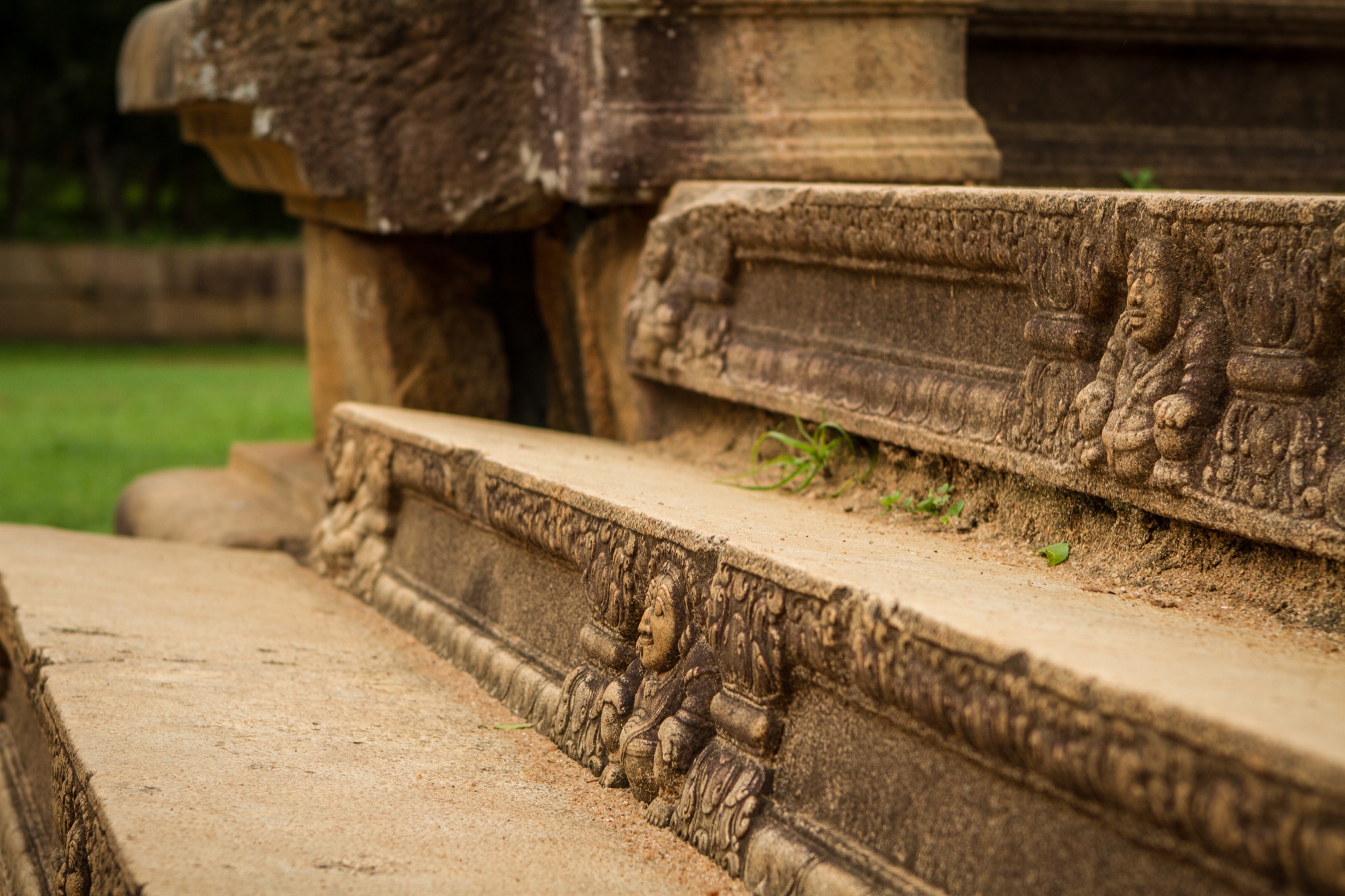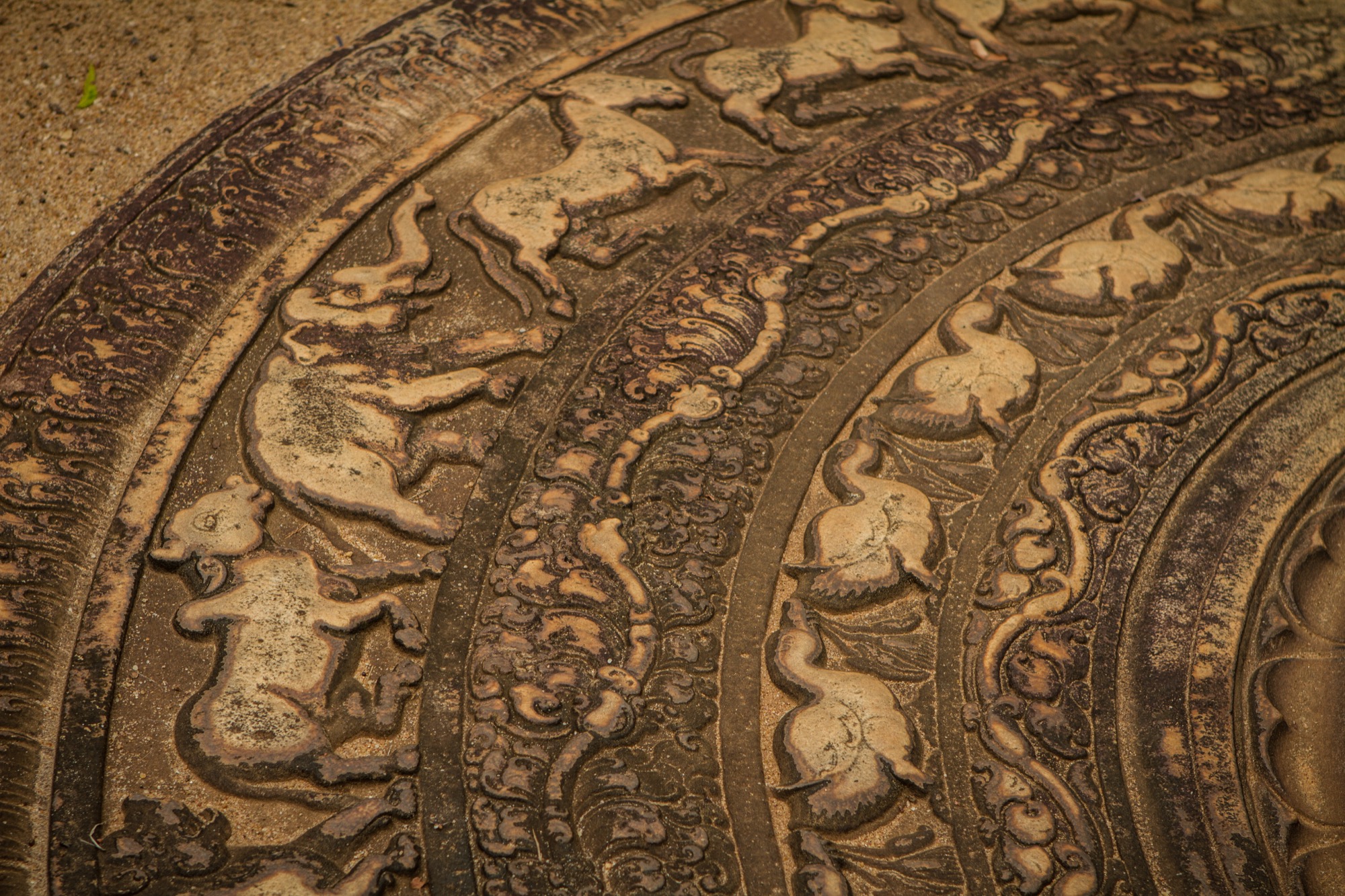 Les deux étapes suivantes sont moins impressionnantes en terme de dimension mais tout aussi importantes pour ce qui de leur rareté et de leur beauté architecturale. Le premier est une pierre de lune marquant l’entrée des ruines d’un temple. Son état de conservation est absolument remarquable et retrace parfaitement les différents cercles et symboles du parcours bouddhiste menant au nirvana, au centre de la pierre. Splendide.