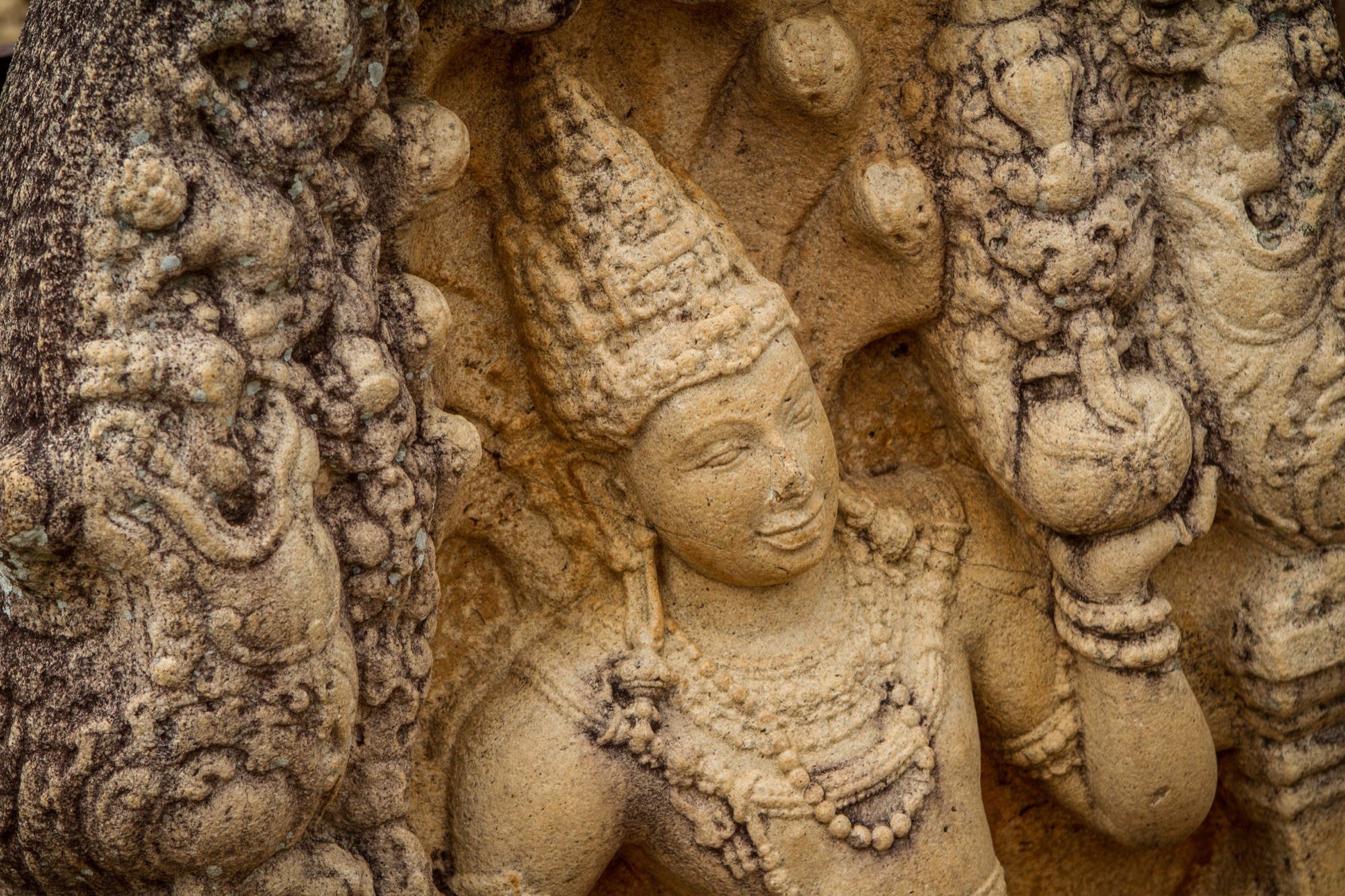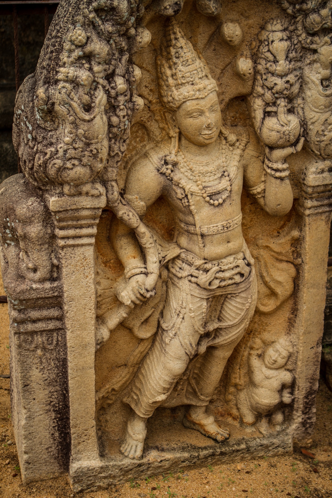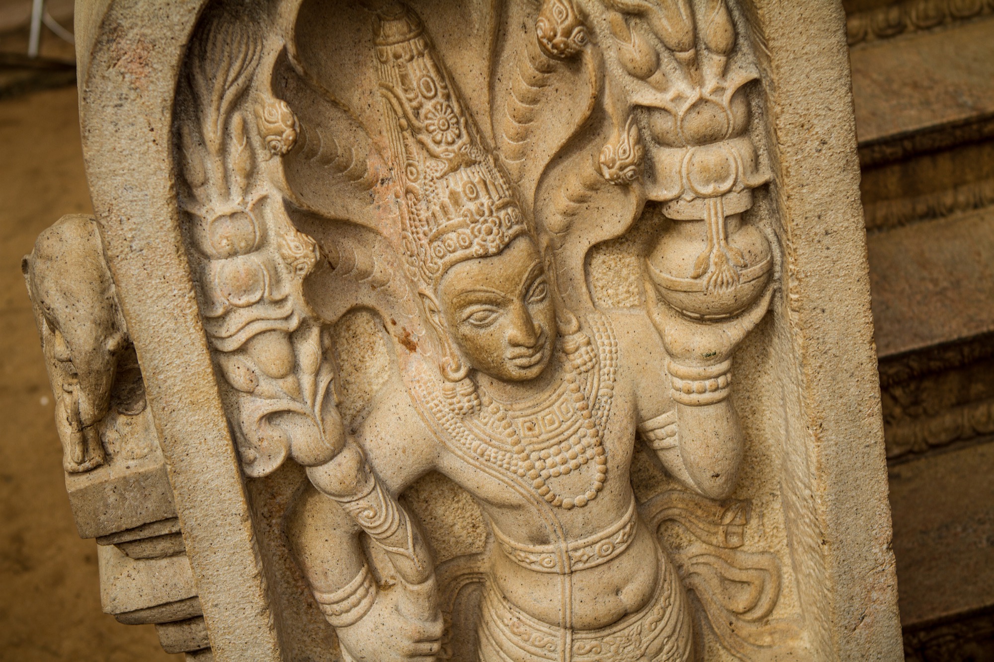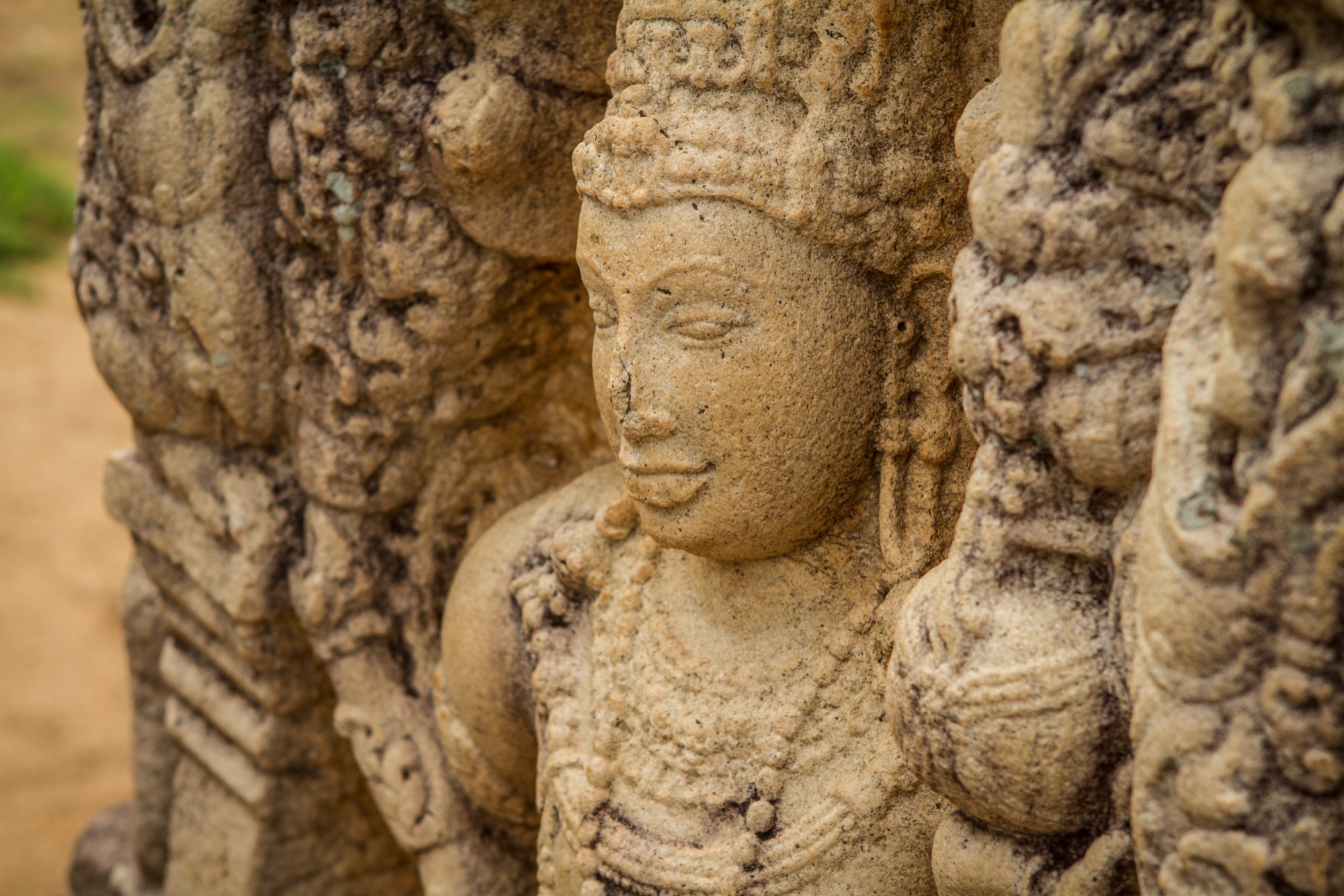 Les deux étapes suivantes sont moins impressionnantes en terme de dimension mais tout aussi importantes pour ce qui de leur rareté et de leur beauté architecturale. Le premier est une pierre de lune marquant l’entrée des ruines d’un temple. Son état de conservation est absolument remarquable et retrace parfaitement les différents cercles et symboles du parcours bouddhiste menant au nirvana, au centre de la pierre. Splendide.