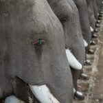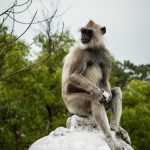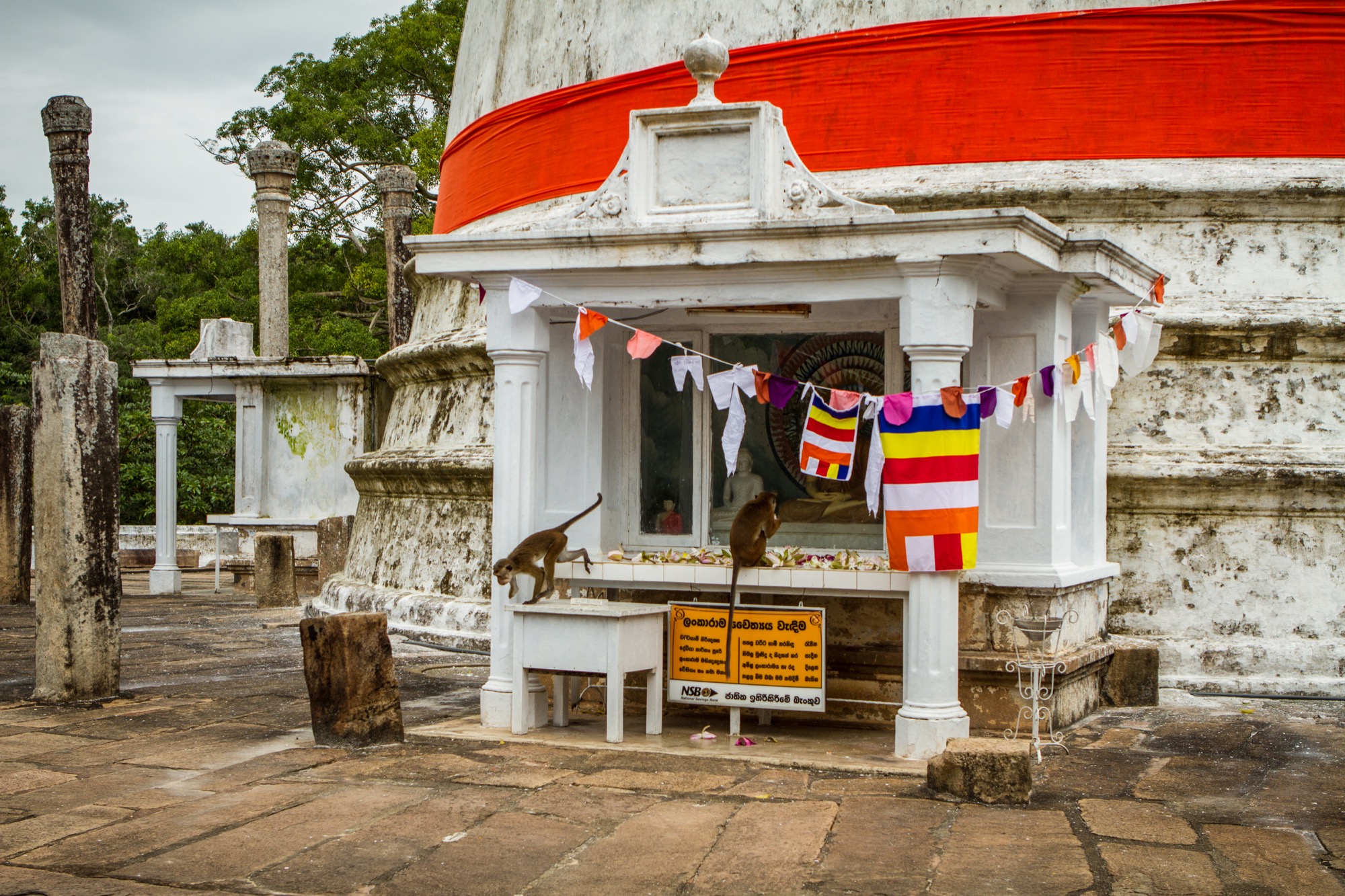 Il y a également les bassins des éléphants, sorte de Grand Canal de Versailles avant l’heure, gigantesque et un peu à l’écart de la route principale. On pourrait passer des heures et des heures à marcher à Anuradhapura, entre ruines bien identifiées et d’autres, noyées dans la forêt. L’étendue de la cité est frappante alors que les coups de pédale m’emmènent plus au sud, dans l’autre moitié de la ville. Il fait toujours plus chaud. Un rapide arrêt au musée d’Abhayagiri est par ailleurs plus que nécessaire pour se rendre compte des merveilles récupérées sur le site pendant les fouilles. Statues, objets d’art, toilettes aussi, il y a de tout, bien expliqué et conservé. Même chose avec un autre temple, un peu à part, Lankarama, avec ses drôles de singes. A ne pas manquer.