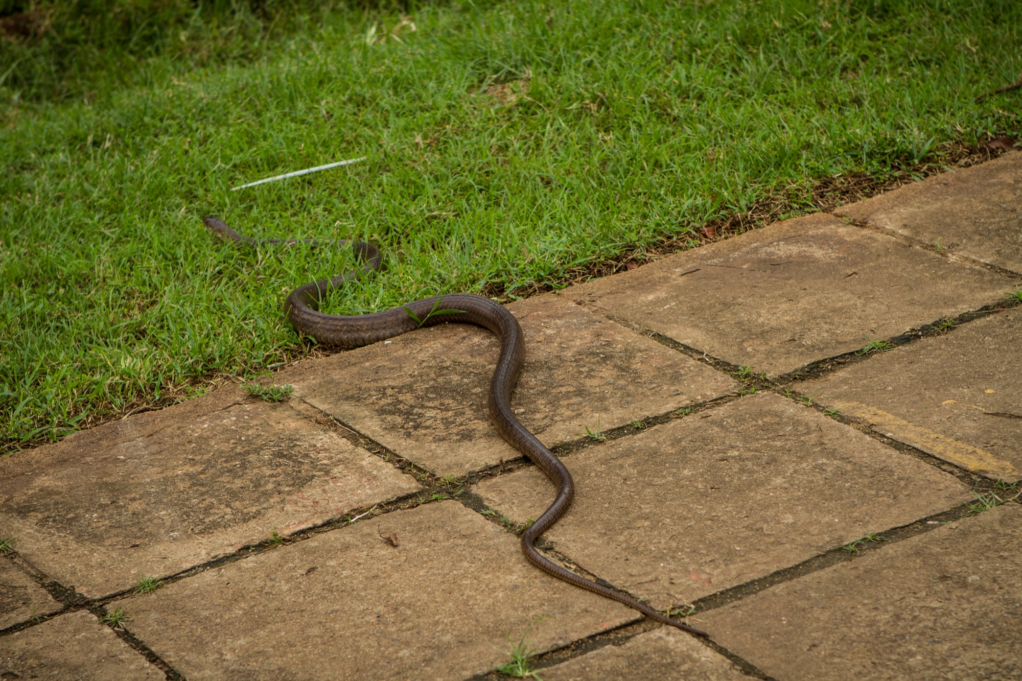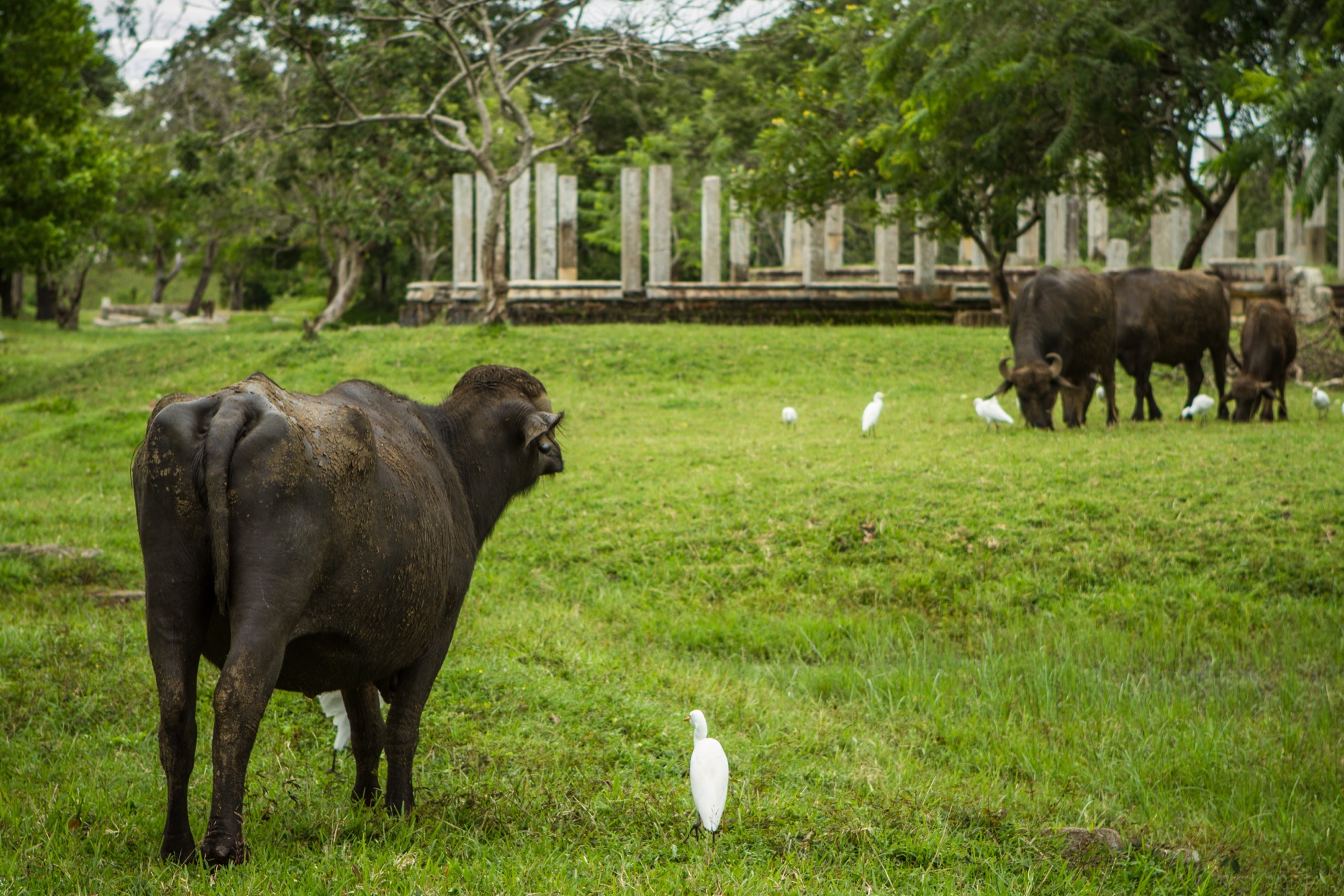 Les vélos sont garés au temple suivant, Thuparamaya. D’aspect presque sage, il s’agit en réalité du premier stupa construit au Sri Lanka après l’introduction du bouddhisme dans l’île, la construction s’effectuant donc entre 250 et 210 av. J-C ! Au loin, un autre stupa domine, celui de Ruwanwelisaya. On y accède en traversant un grand parc dans lequel paissent des boeufs. Un coup d’œil à gauche pour les observer, ainsi que les grues qui cohabitent avec eux et devant moi, c’est un serpent qui traverse le chemin. Tranquille. Normal.