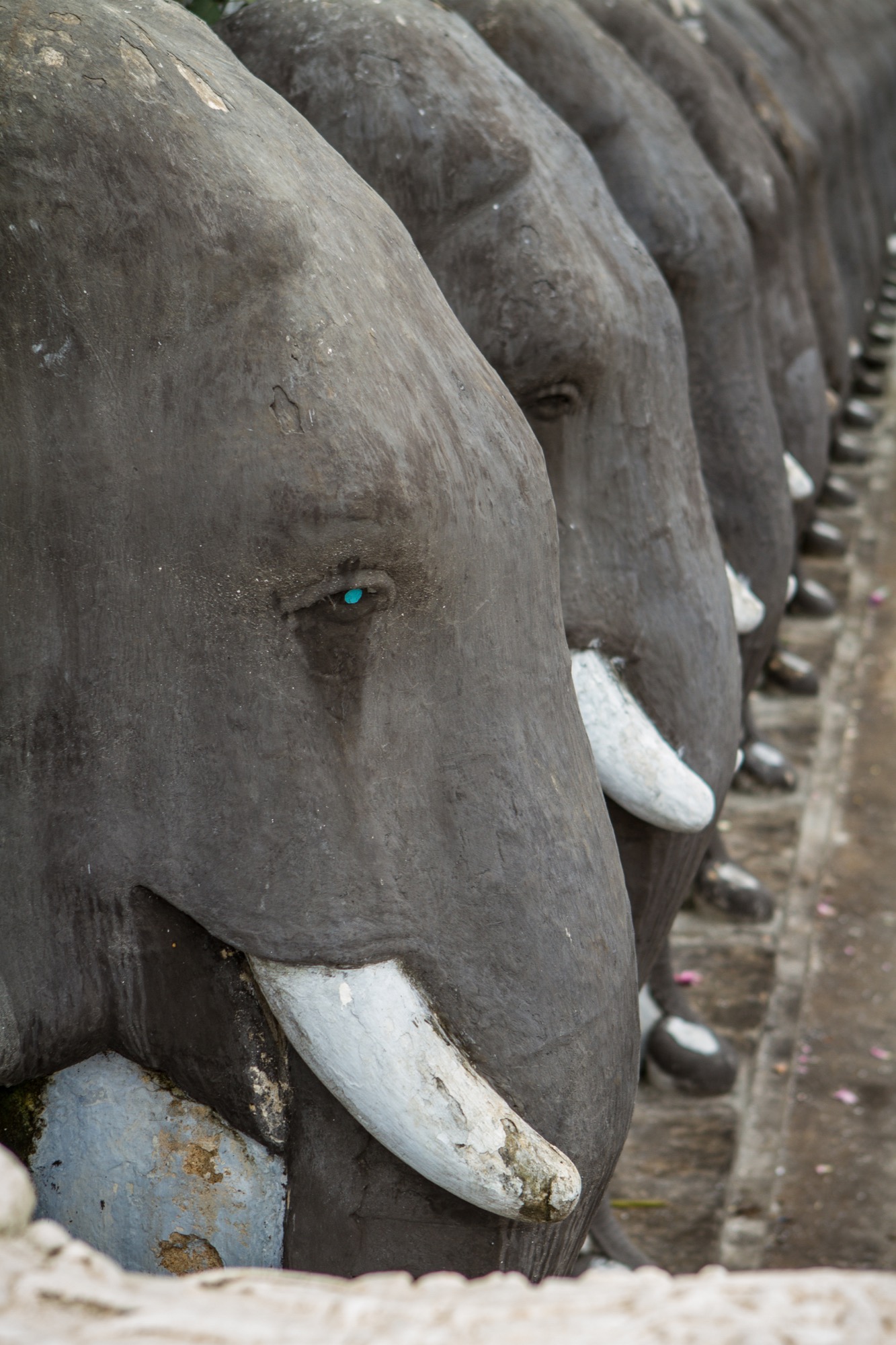 Le stupa suivant est peut-être encore plus imposant que le précédent. Plus récent, surtout peint d’un blanc éclatant au soleil, on note toutefois qu’il y a subi quelques dommages du temps avec une forme un peu gondolée de ses courbes ! A noter, les enfilades d’éléphants à sa base et les beaux autels aux quatre points cardinaux à la base du stupa.