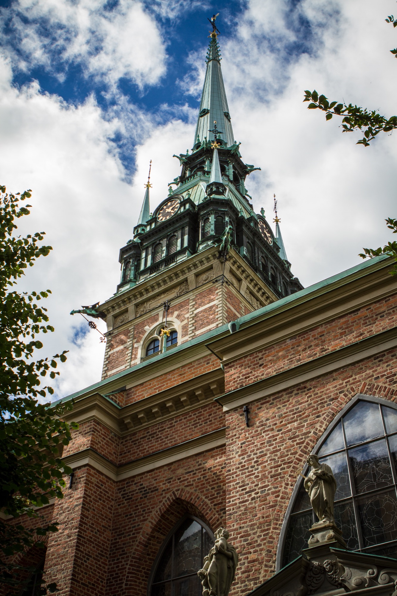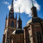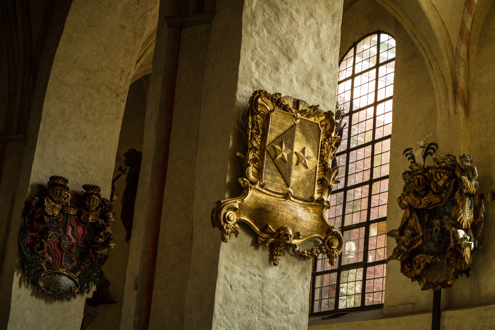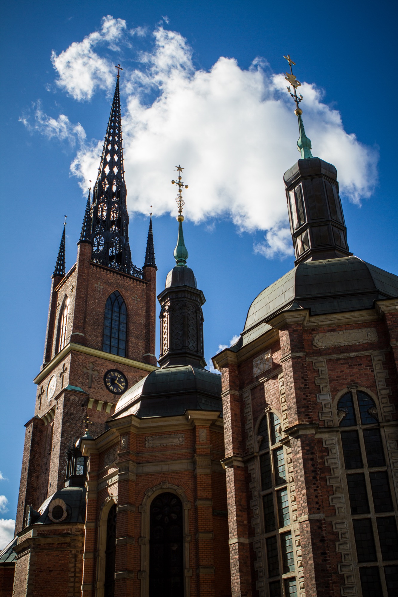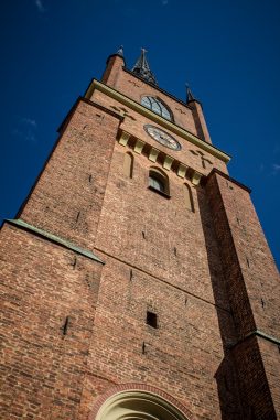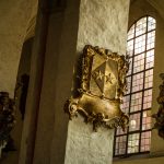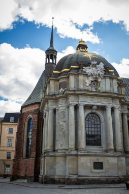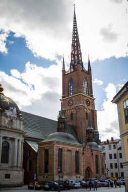 Changement d’île le temps d’une escale dans l’église de Riddarholmen (l’îlot des chevaliers) : Riddarholmskyrkan. C’est ici que sont enterrés les rois et reines de Suède depuis le XVIème siècle. Blasons et stèles partout au sol et sur les murs et petites chapelles pour les reines d’un côté, rois de l’autre avec au centre, deux splendides sarcophages, majestueux.