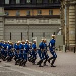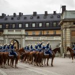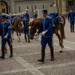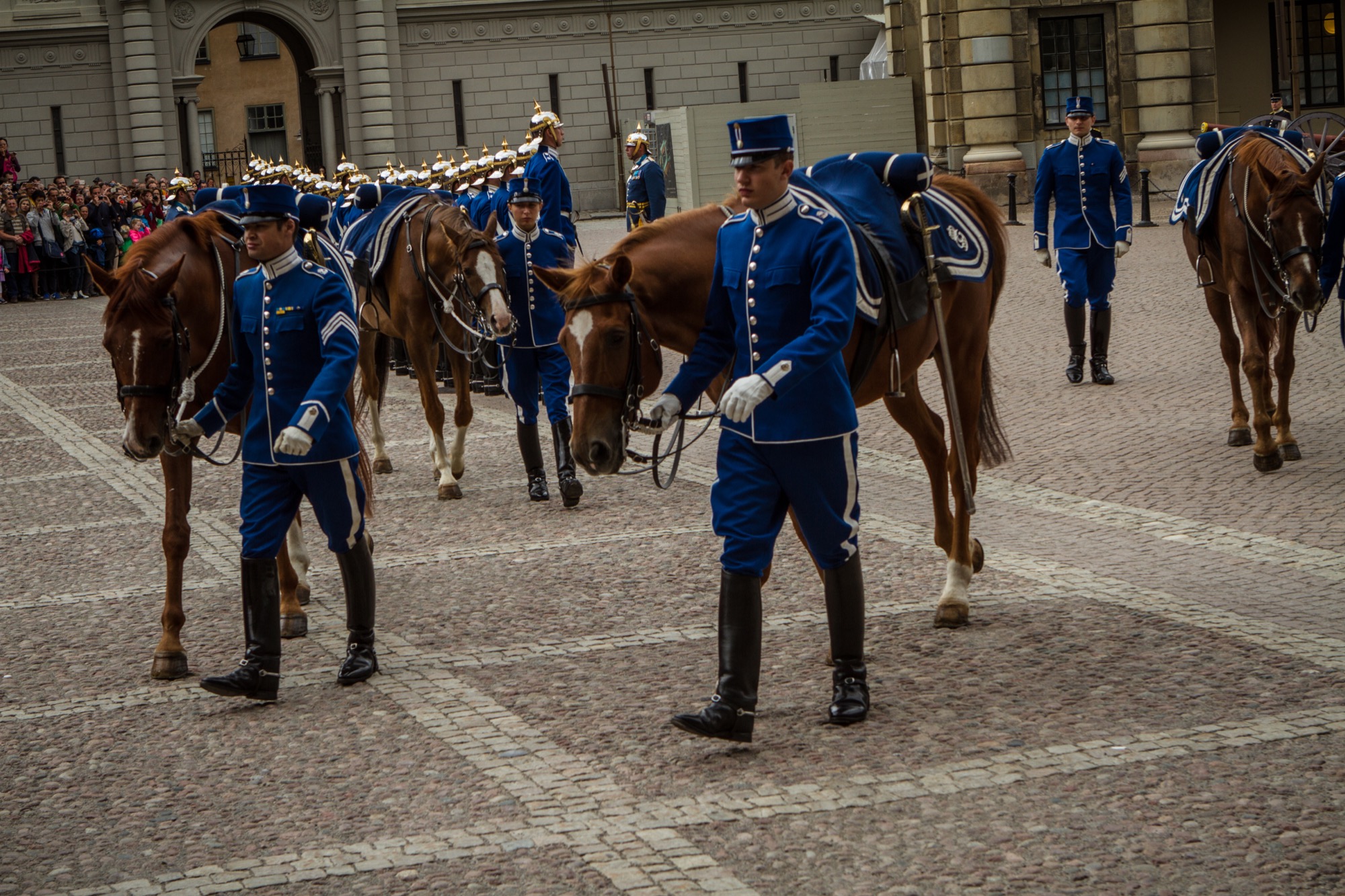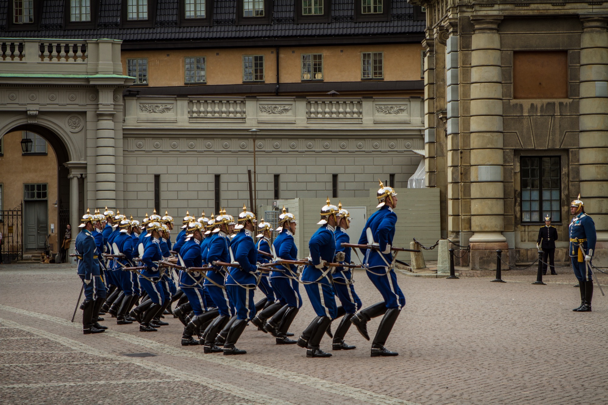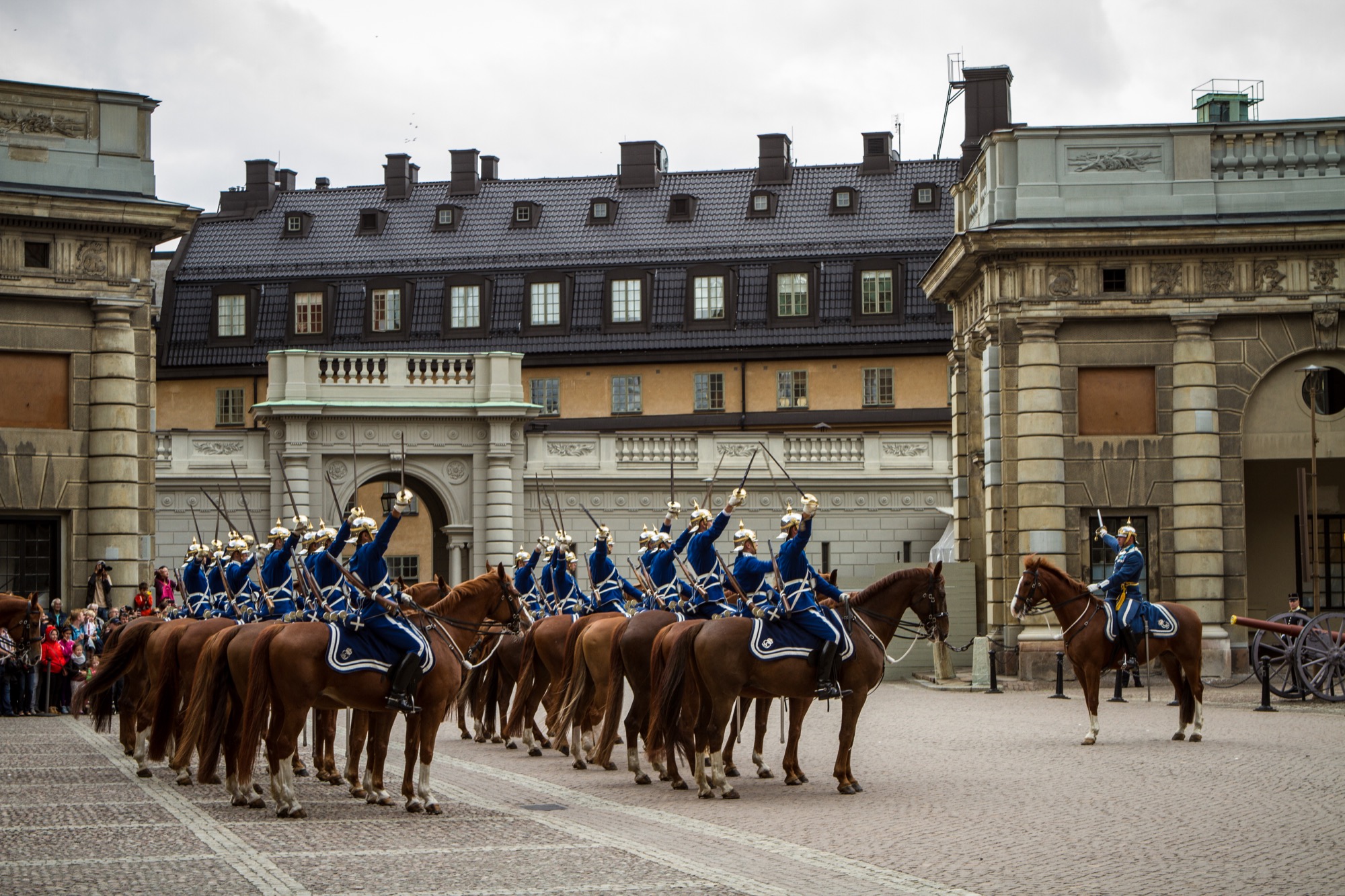 La visite de l’île majeure de Stockholm commence par le fameux palais royal qui la défigure, monstre de pierre austère au milieu de jolis immeubles colorés et de jolies ruelles pavées. Difficile de tomber en pâmoison devant ce gros bloc sans grande âme, totalement statutaire et dénué de chaleur. Du coup, j’assiste l’œil à la fois amusé et blasé la traditionnelle relève de la garde qui se fait devant une foule massive. Folklore, bien sûr, tradition aussi, au pied d’un colosse aux façades fermées.