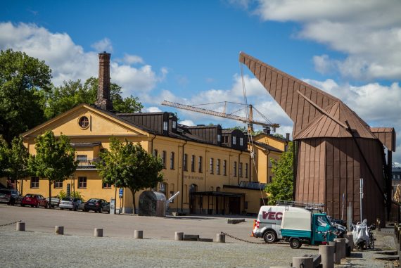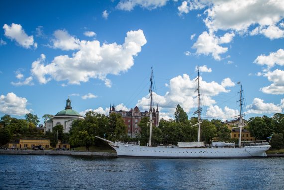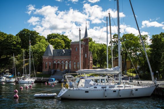 Tandis que l’on progresse sur la rive ouest, les caractéristiques de la petite île voisine se laissent entrevoir et surtout font bien comprendre son nom : Kastellholmen. Il y a bien là au sommet de ce petit rocher entouré d’eaux baignées de navires à l’amarre un petit château, dominant l’île très proche de Djurgården.