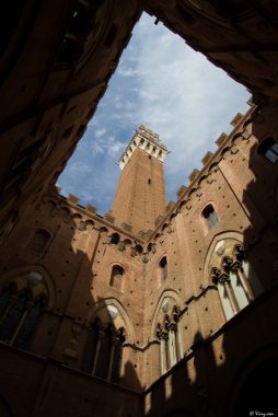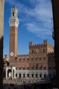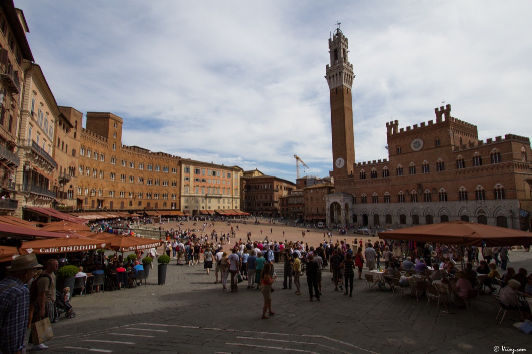La remontée vers le cœur de la ville se fait sous les murs imposants des immeubles centenaires. Le visiteur que je suis est d’ores et déjà ravi mais il ne sait pas encore quel choc lui réserve ce croisement de rues. La tête se tourne sur la gauche, attirée par la foule qui stationne ici, sans raison à priori. Il s’agit en fait d’une des voies d’accès à la Piazza del Campo, la fameuse place en forme de coquillage que surplombe la Torre Del Mangia. Le regard se perd alors sur les façades époustouflantes, sur le pavement splendide de la place et son dessin si particulier. Impossible de ne pas tomber sous le charme de cette place légendaire et là-aussi difficile de s’arracher à son spectacle pour la traverser et pénétrer dans le bâtiment de la mairie. Cela ne fait guère qu’une heure que je suis à Sienne et je ne veux déjà plus repartir.