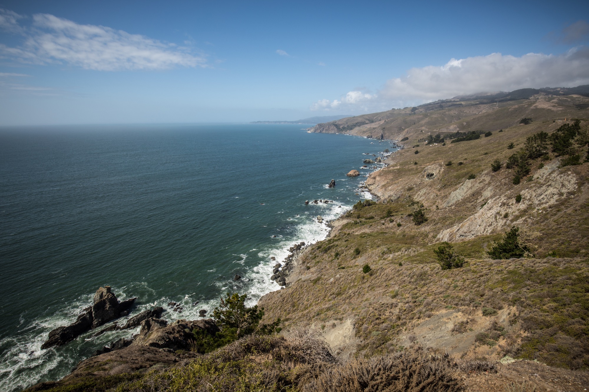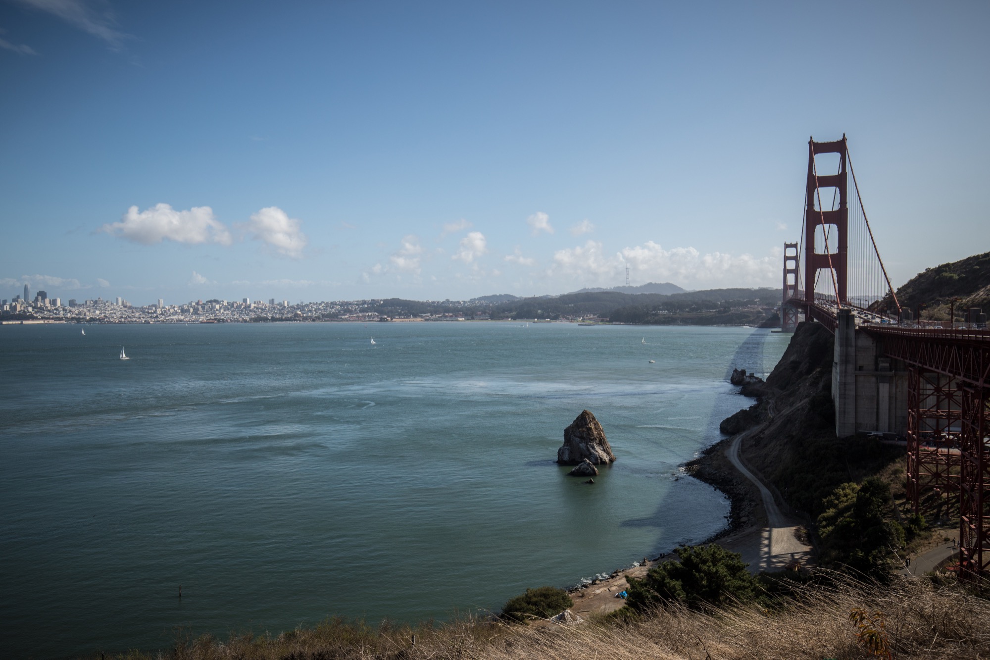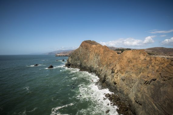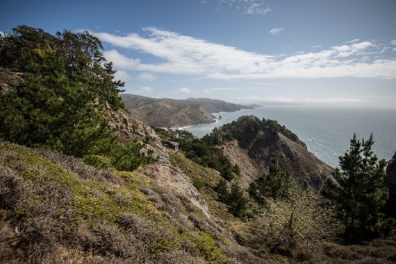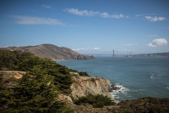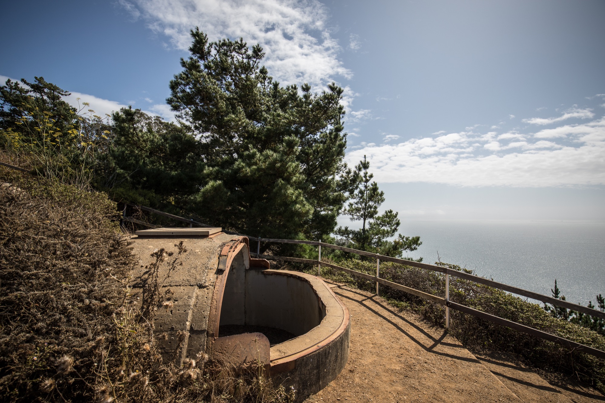 Je reprends la route de San Francisco, restant sur la route 1 jusqu’à Stinson Beach, dépassant le village de Bolinas. La route monte alors sur les hauteurs de la côte, fonçant vers le Golden Gate NRA. Les séquoias de Muir Woods et les bois alentours, sauvés presque par miracle, sont dépassés et Muir Beach se laisse entrevoir. On découvre un petit parking permettant d’accéder à un point de vue magistral sur la côte nord de San Francisco, avec ses anciennes batteries de défense datant de la Seconde Guerre Mondiale.